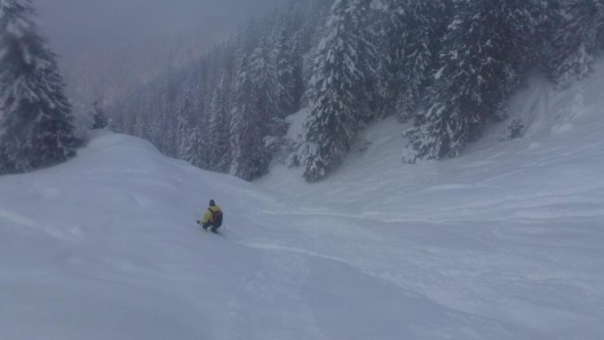 Zurück am Depot bereiteten wir uns auf die Abfahrt vor. Diese geht schnell in die überaus steile Rinne hinein. Es ist in dem tiefen und bereits gut gesetzten Pulverschnee fast ein Hinunterschweben ... einfach spektakulär ... Sicheres Schifahren ist ein Muss! Und die Verhältnisse müssen astrein sein.