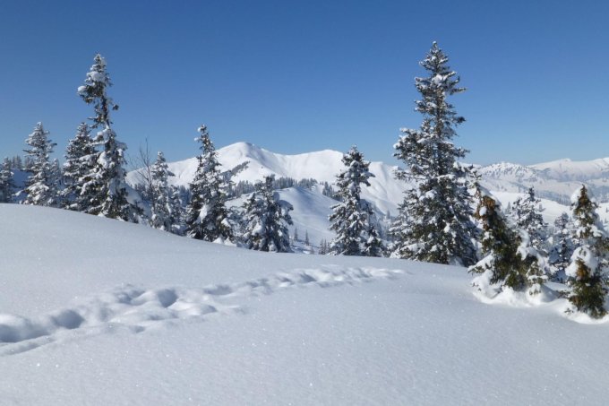 Allerdings schon einige Abfahrtsspuren vorhanden. Aber immer noch genügend Platz für unverspurte Hänge.