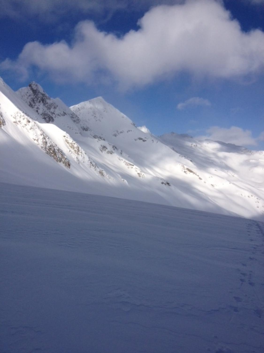 Auf der ganzen Tour hat es zwischen 20 und 30 cm Neuschnee. Wir konnten direkt ab er Leckipasshöhe abfahren. Ebenfalls konnten wir vom Gipfelkreuz des Gross Muttenhorn direkt abfahren.