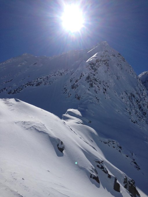 Dank der kalten Temperaturen bester Pulverschnee bis ins Tal. Vom Surettajoch über die Wächte mit den Skis. Dann weiter zu Fuss zum Quergang. Auf 2900m umgekehrt wegen der grossen Schneemenge bzw. Spurarbeit in der Nordostflanke.