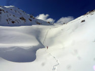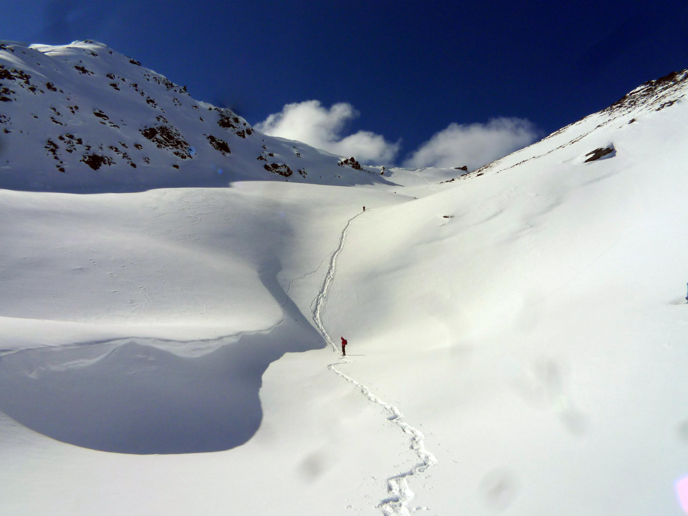 Im Gebiet Bella Tola und Bortertälli in den Nord- und Osthängen feinster Pulverschnee. Die Pässe und Rücken sind vielfach aper. Die Südhänge beginnen langsam an zu deckeln. Auf den Gräten windig.