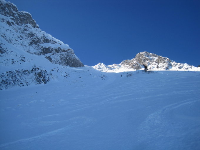 Momentan noch überraschend gute Verhältnisse mit viel Pulverschnee. Ab Sattel echte Frühlingsverhältnisse! Die linke Seite des Schlusshanges ist infolge des Schneebrettes praktisch nicht fahrbar!