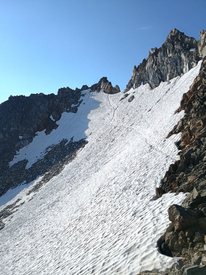 Abgebrochen vor Gross Leckihorn wegen aufkommendem Regen. Abstieg via Firnfeld in Richtung Route Leckipass-Rotondohütte weglos und problemlos.