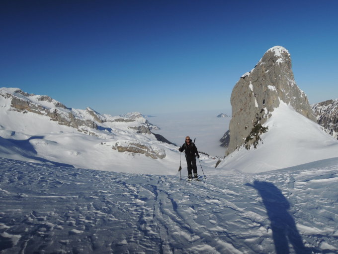 Abfahrt meistens recht mühsam und wenig lohnend. Wenige Pulverflächen unterhalb Waldgrenze. Dafür an einigen Hängen schöner Sulz.