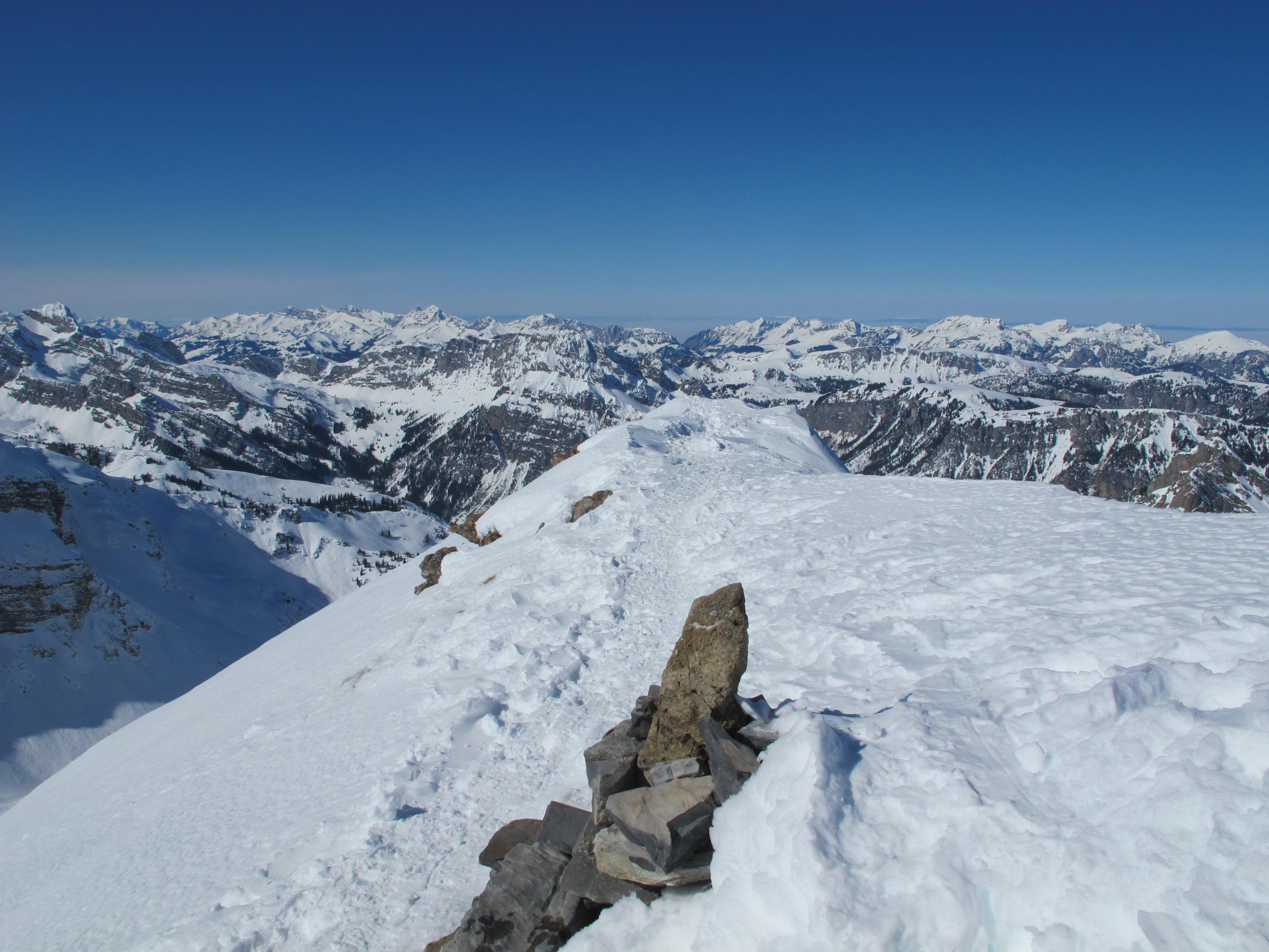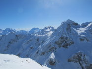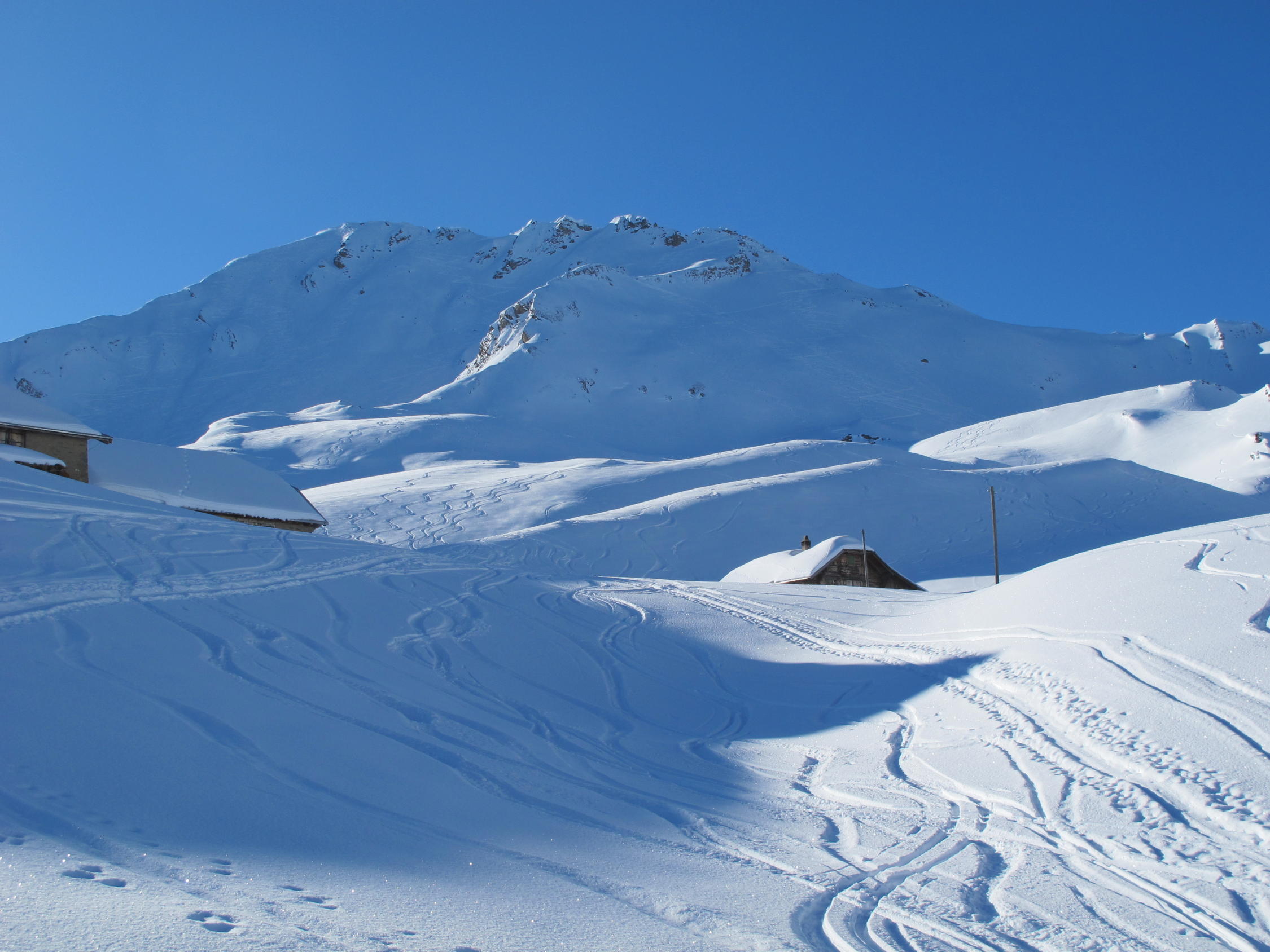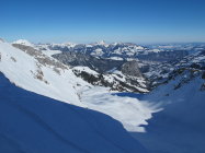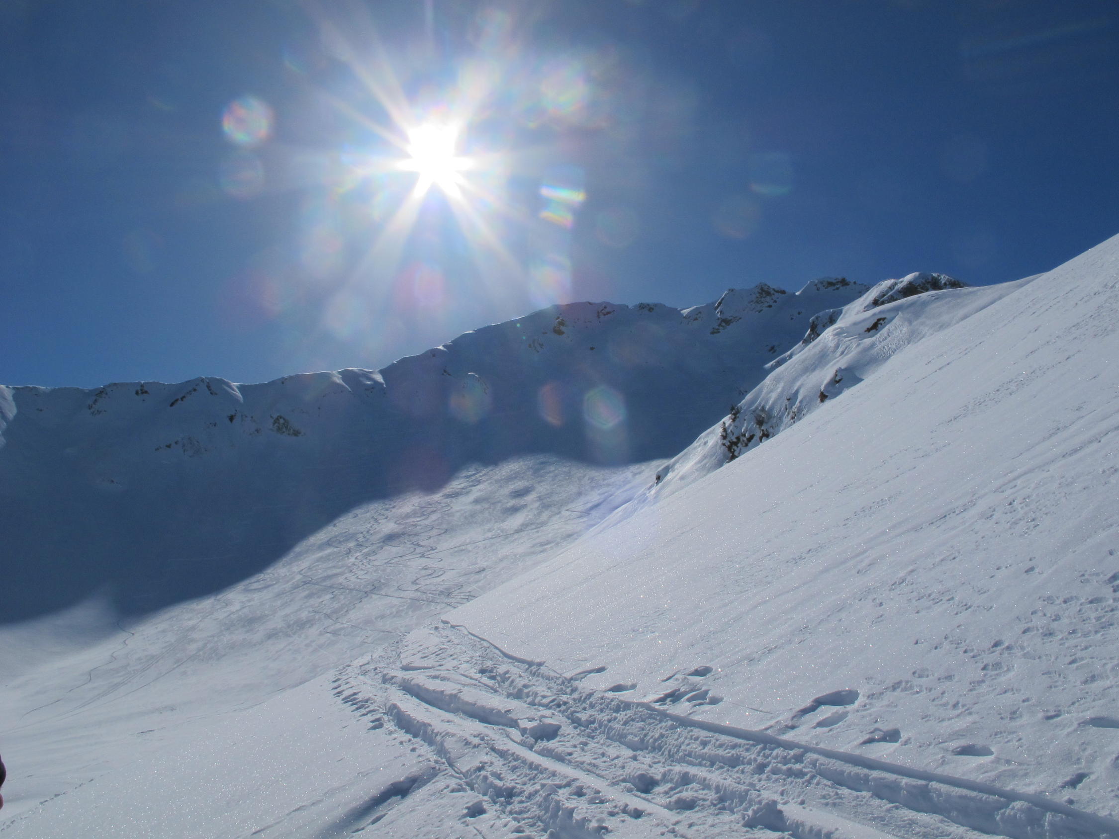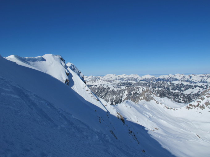 Pulverschnee fast auf der ganzen Route, im Gipfelbereich zerfahren und ab und zu alte eingeschneite Spuren im Steilhang