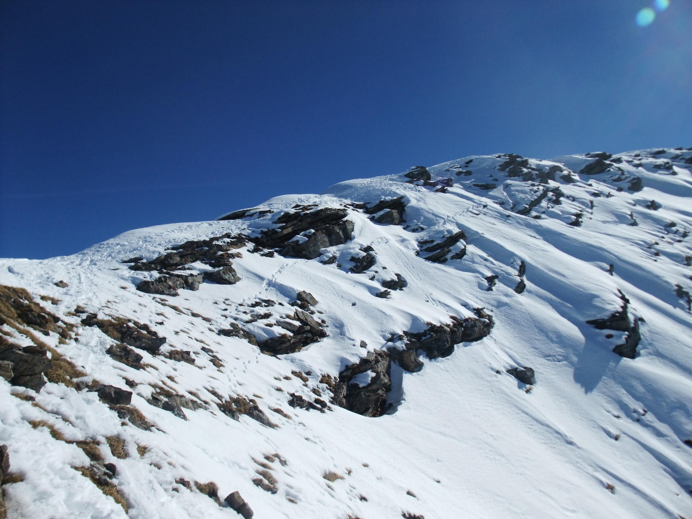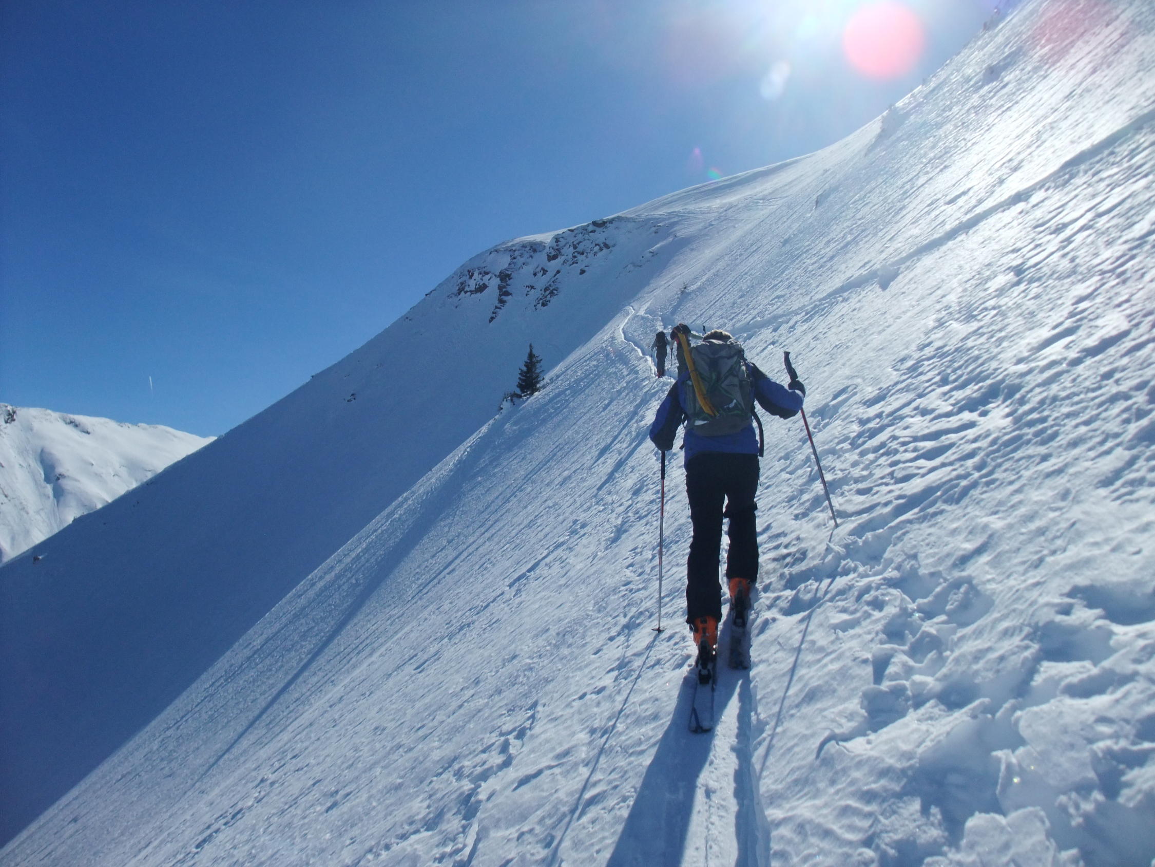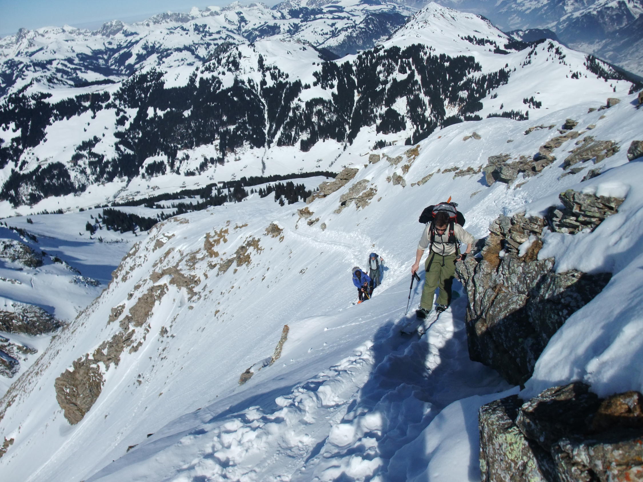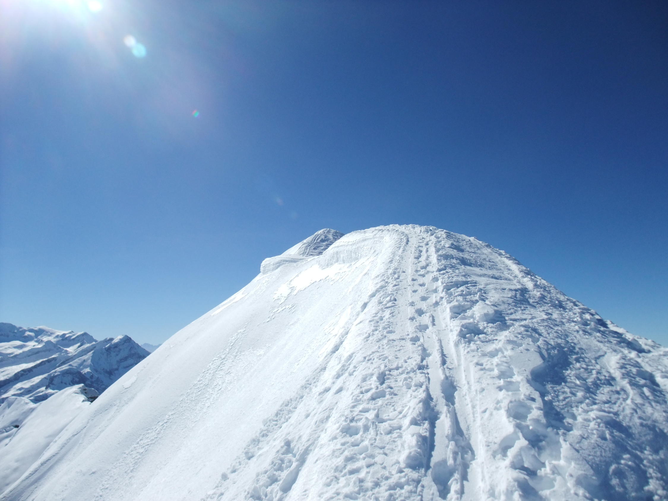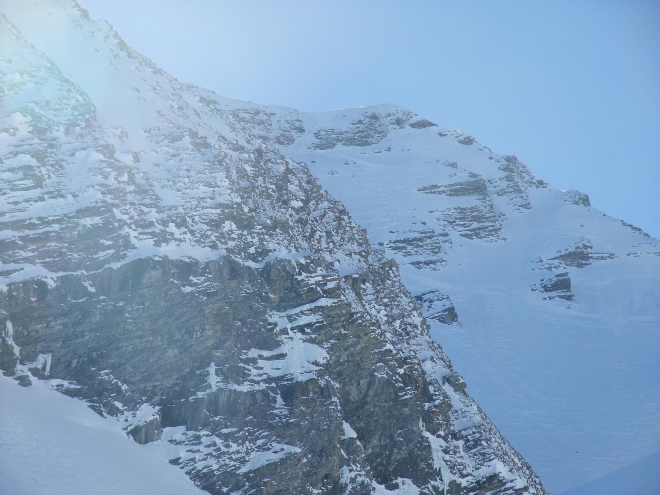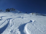 Gut, unten beim Aufstieg hart, bei der Abfahrt gegen 14:30 weich und schwer. Gute Spur und mit den Ski bis auf den Gipfel. Sind nicht durchs Couloir sondern kurz 50 meter vom Gipfel nach Westen abgestiegen und dann in die Nordflanke. Hier schon viele Spuren aber genügend Platz. Top Wetter und kein Wind.