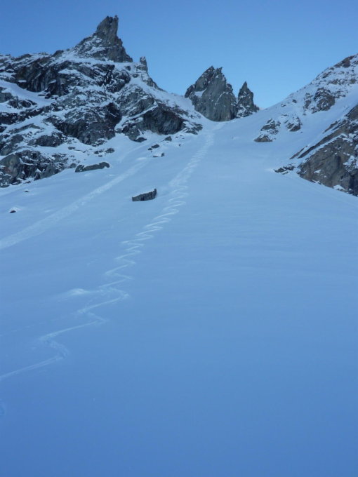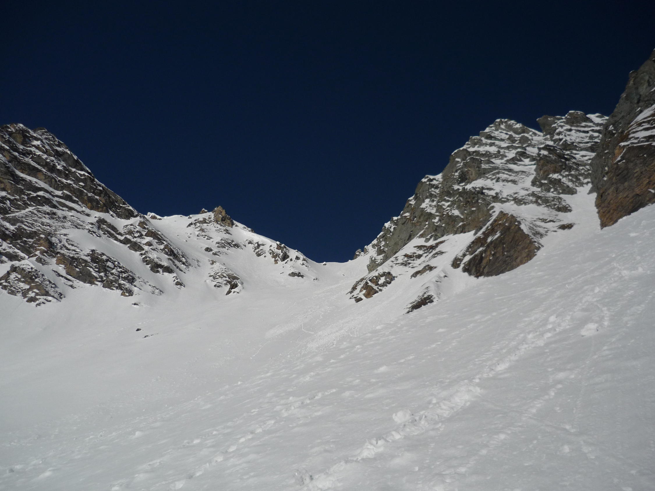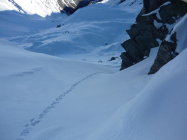 Aus diesem Grund halte ich den Aufstieg durch die Flanke als die bessere und auch schnellere Variante, als die Meinige, wie sie im Skitourenführer beschriebenen ist.
