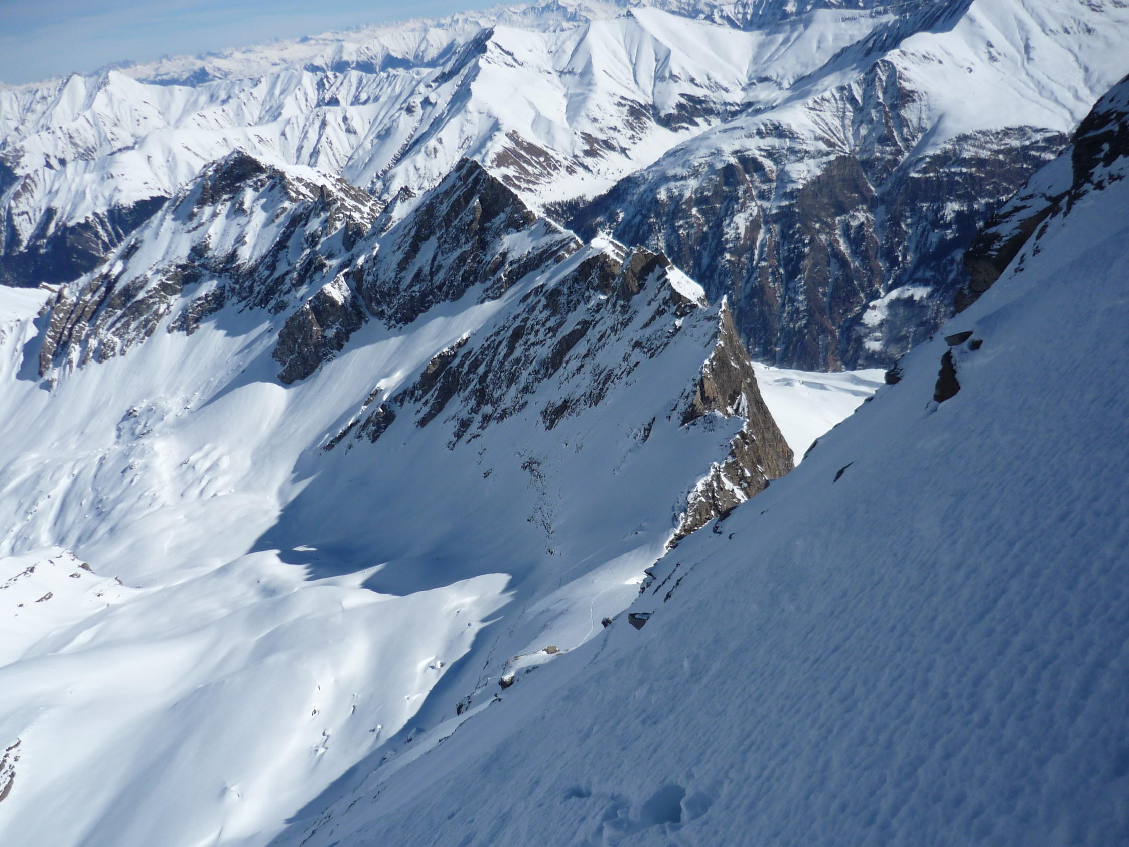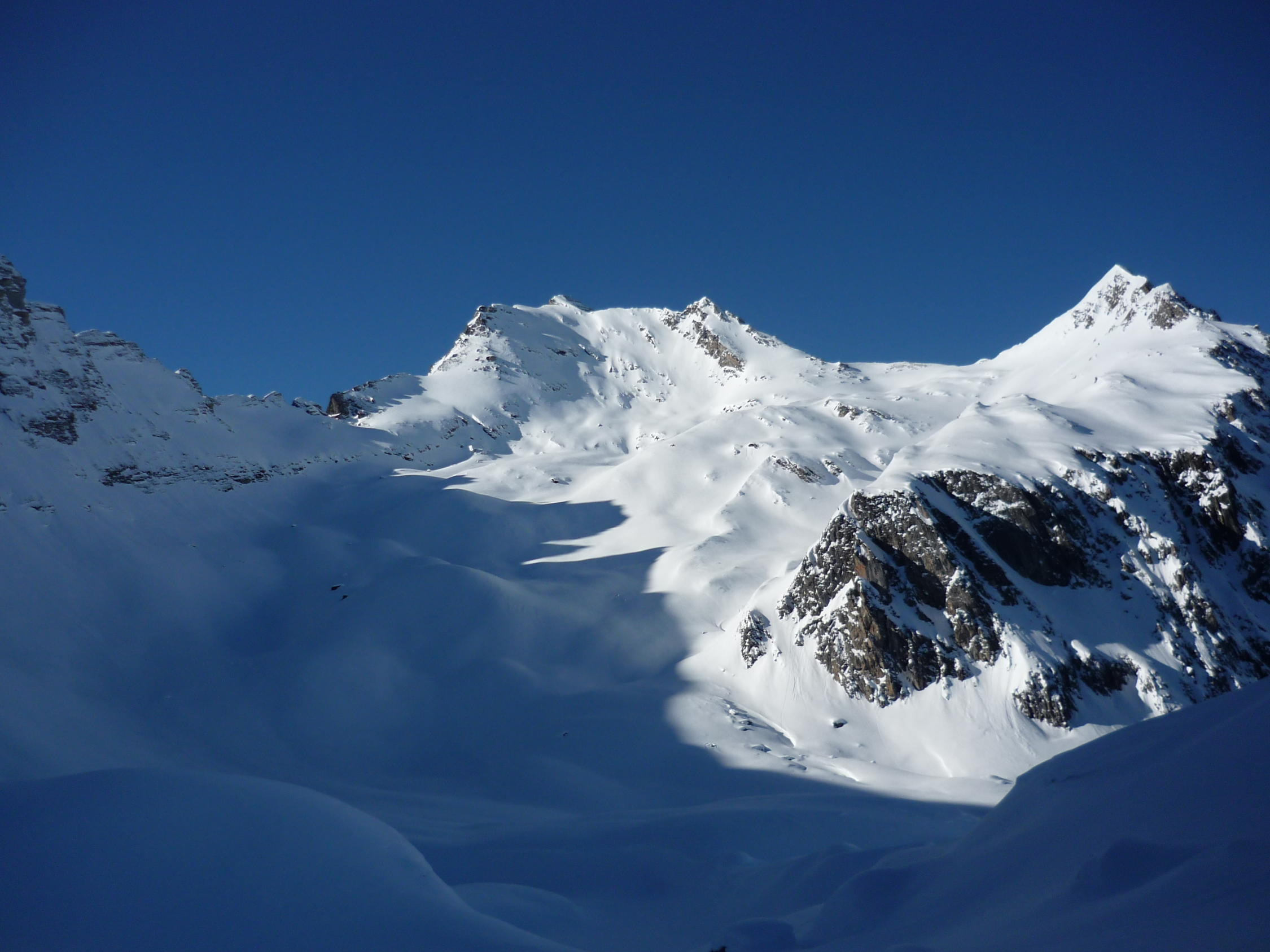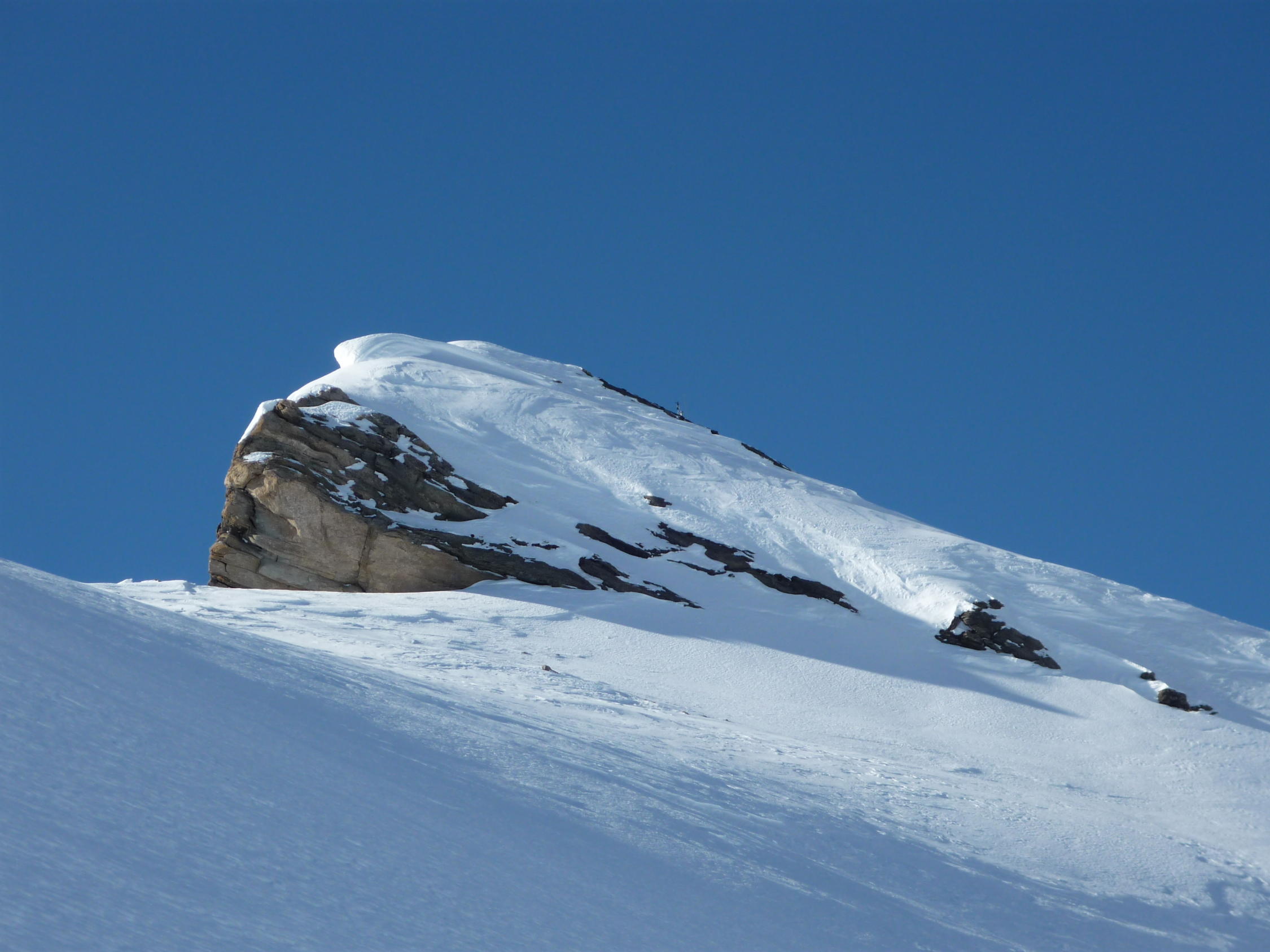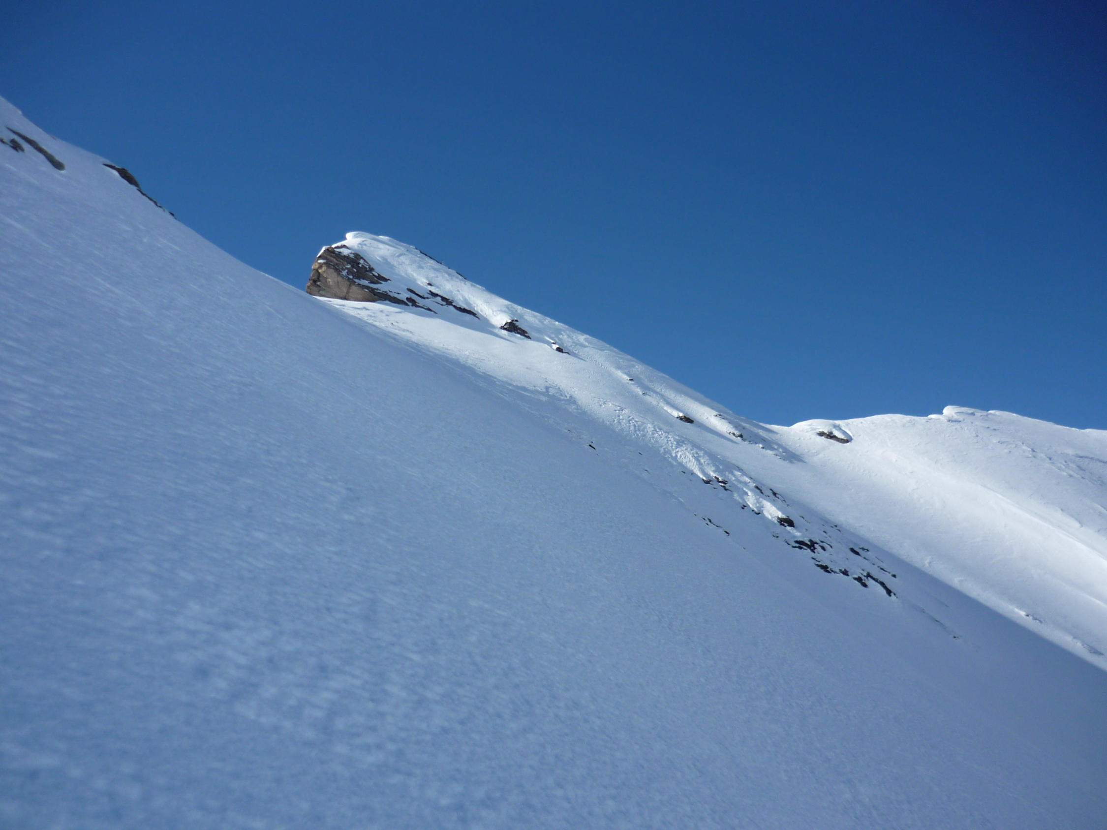 Mein Umkehrpunkt 100 Hm unter dem Gipfel ist auf die Tatsache zurückzuführen, dass in der Gipfelflanke extrem viel bodenloser Schwimmschnee vorhanden war. Ebenfalls ist diese Flanke unten felsig, was mir solo nicht so gefiel. Teilweise bin ich bis zu den Schultern durchgefallen, da das Gelände unter dem Schnee aus vielen kleinen Felsbändern besteht.
