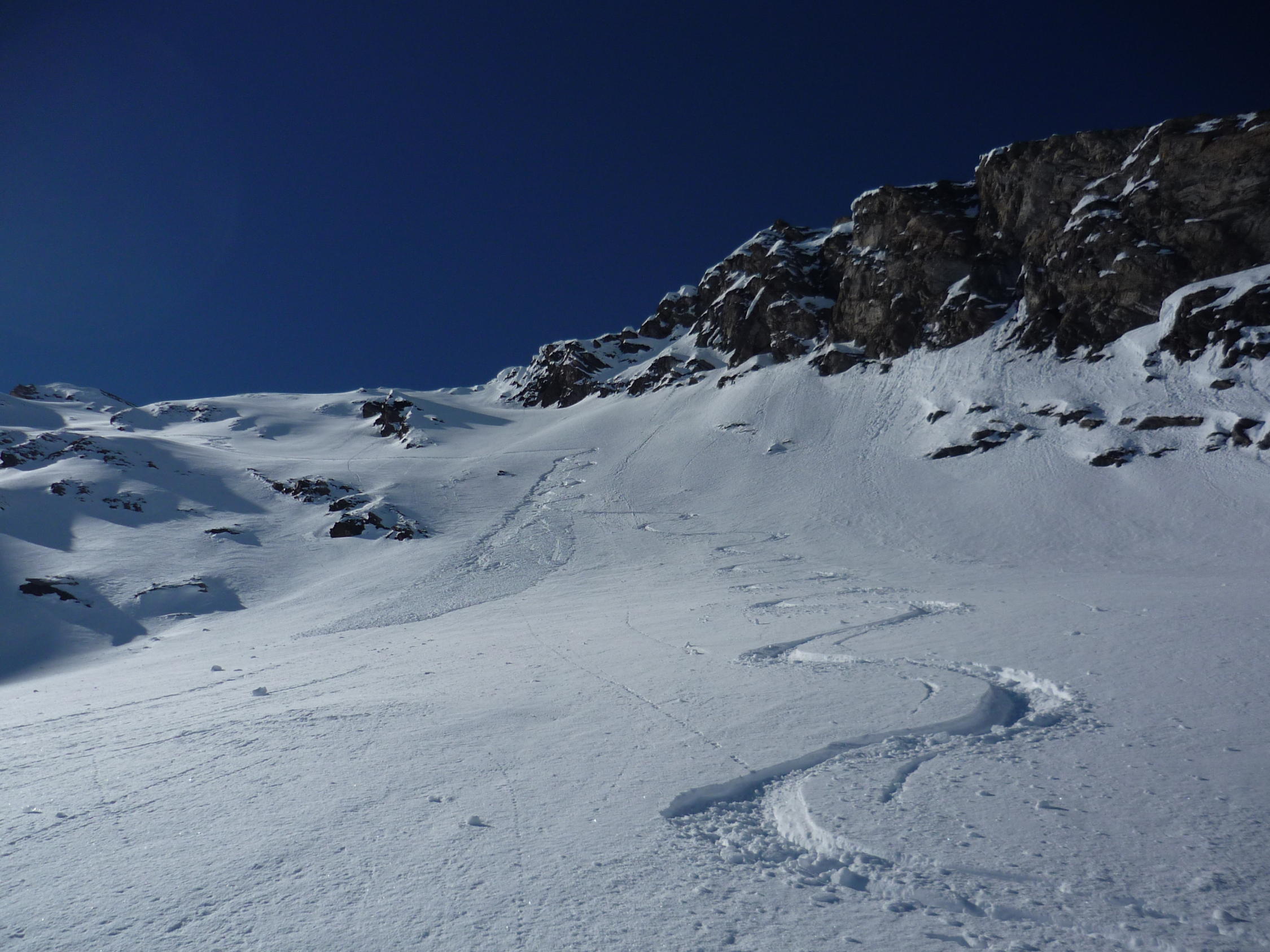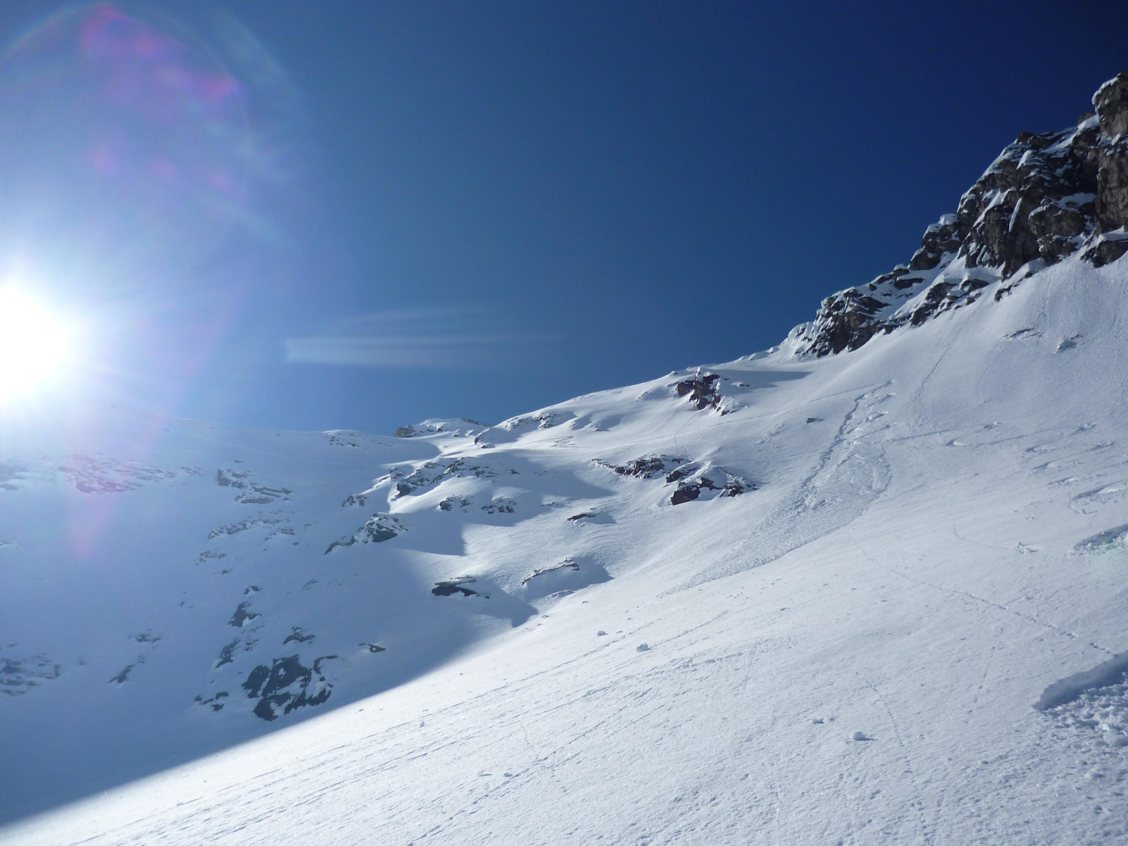 Ebenfalls vom Seeboden hinauf alles herrlicher Pulver. Auch hier gleicher Schnee Unteraufbau wie in der Ostseite der Satteltilücke.