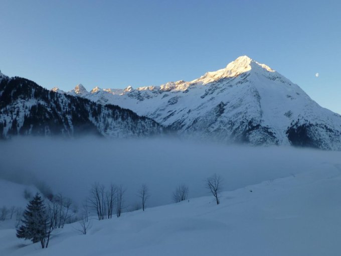 Zustieg war z.T. gespurt, gute Aufstiegsspur durch die NE-Flanke, Abfahrtspuren bis ins Tal.