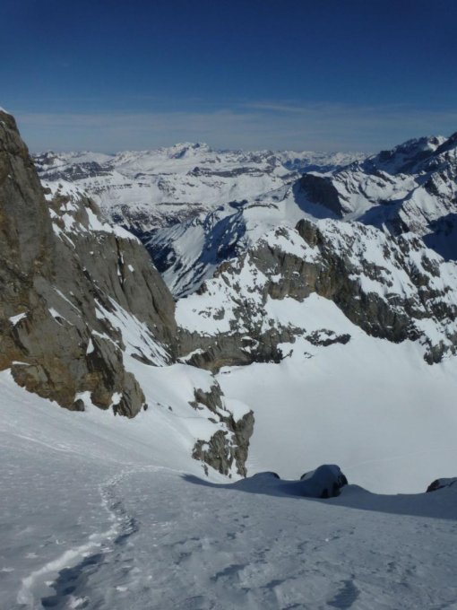 Bis zum Einstieg morgens hart (z.T. Pulver), nachmittags oben Sulz, unten faul. NE-Flanke guter Trittschnee, bei der Abfahrt hart und griffig oder Pulver.