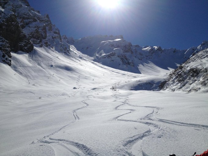 Vom Tüfelschopf-Lückli oben pistenartig, gut griffig, nach 100 Höhenmetern Pulverhänge mit noch genügend Platz.