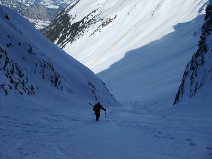 Couloir zu Fuss. Recht mühsam v.a. im oberen Teil. Ansonsten aber gut. Gipfelhang wie im vorhergehenden Eintrag beschrieben etwas gedeckelt und schon recht zerfahren. Von dort bis Einfahrt zurück ins NE-Couloir super. Couloir ging auch besser als erwartet auch wenns bestimmt besser geht. Kein Pulver. Nach Couloir dann wieder Pulver bis unten. Dort langsam schwerer