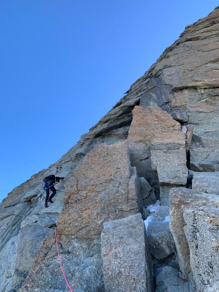Fels trocken von Gabel hoch. Couloir hat ein bisschen schnee, aber gut zu machen. Viele bolts. Gut für abseilen. Bisschen warm. Tiefe schnee zwischen 3900-3400. 50m seil geht, aber für ein abseil im couloir ist 60m besser. 5 leute gipfel erreicht via gleicher route. Viele leute auch umgekehrt am couloir.
