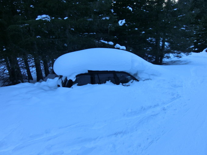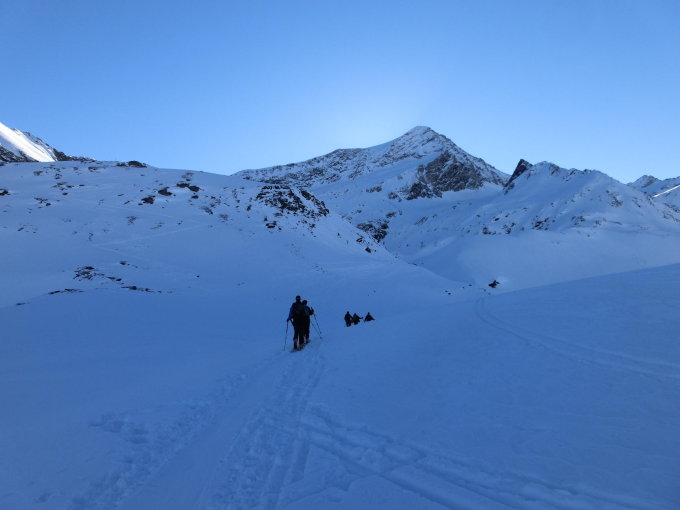 eisige Aufstiegsspur; Harsch auf sonnenbeschienenen Hängen; nordseitige Hänge noch traumhafter Pulver;