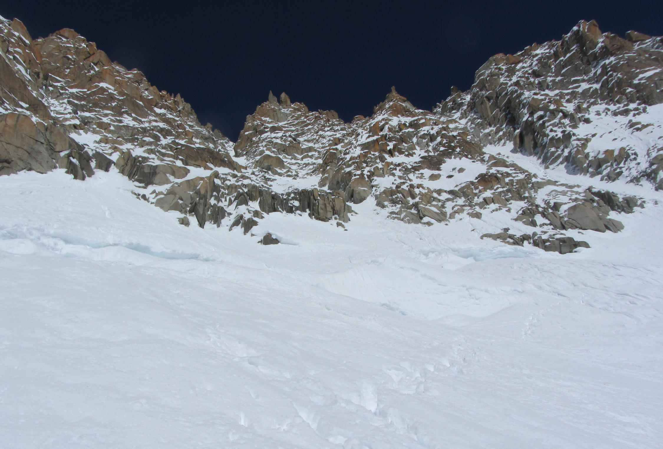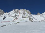 Die Droites mit Skiern - lange habe ich mich gefragt, warum das kaum gemacht wird, nun ja, danach ist man immer schlauer;-). Der Plan war die lila Route so weit wie möglich mit Skiern aufzusteigen, dann Skidepot, zum Gipfel und dann bis Chamonix abfahren. Verhältnismässig lag das nicht drin, viel zu viel ungesetzter Schnee, man ist mit den Skiern mittags beim Aufstieg schon ziemlich eingebrochen, ohne Skier und am Fels folglich nicht möglich, die Hänge unterhalb des Col de Droites sind auch noch nicht unten. Normalweg war wegen der Schneemassen auch nicht gut vorstellbar. Beim Südcouloir bestand immerhin die Hoffnung, dass es Spuren von den Nordwandbegehern gibt und dass man schnell rauf und wieder runterkommt.
