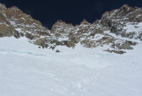 Bis unterhalb des Bergschrunds einigermassen gut mit Skiern und Harscheisen möglich, teilweise etwas akrobatisch, da steil und eisig, dann wieder Bruchharsch. Die ersten 100 m Couloir gut, dann im steilen Teil dünne Eisschicht auf Fels, keine Sicherungsmöglichkeiten. Danach nicht haltender, mehr oder weniger tiefer unverbundener Schnee mit nach wie vor kaum Sicherungsmöglichkeiten, sehr heikel. Wir haben unterhalb der Breche abgebrochen, da wir das Couloir aufgrund der tageszeitlichen Erwärmung erst wieder abends hätten absteigen können und die Wühlerei viel Zeit gekostet hat. Die Abseilstände sind momentan auch eher unter den Schneemassen, d.h. entweder Suchen und/ oder Neueinrichten, Nordwand wurde seit Wochen nicht begangen.