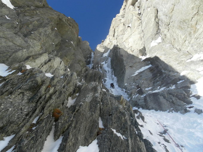 Sehr gute Verhältnisse im Gully. Die Modica-Noury ist dieses Jahr ausserordentlich gut gebildet. Im Gully kann man praktisch ohne Felskontakt klettern. An der Sonne warm, im Schatten dann aber ziemlich frisch. Am Samstag mit drei Seilschaften eher mässig besucht.