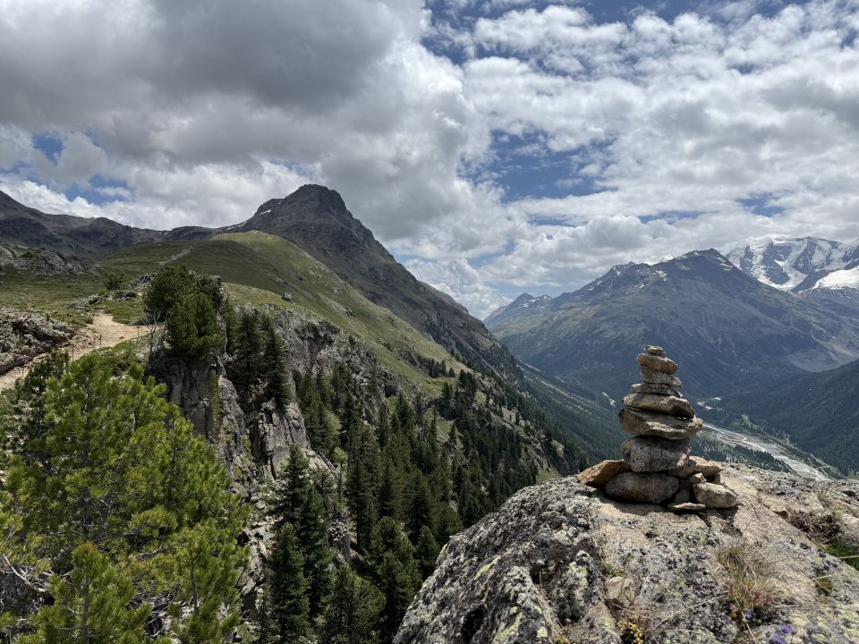 Einfache Rundtour auf den Aussichtspunkt 2388 resp. 2400, Abstieg via Alp Languard, T3. Start Pontresina Friedhof Sta. Maria/Burgturm Spaniola 10 Uhr, leicht bewölkt. Schöner Wanderweg rotweiss markiert bis zum Punkt 2388. Abstieg via Alp Languard zur Post mit ÖV. Wir wollten eigentlich eine Wanderung auf Muottas Muragl Richtung Piz Vadret 3199 machen, um 7.30 Uhr regnete es stark bis 10 Uhr, darum Programmänderung.