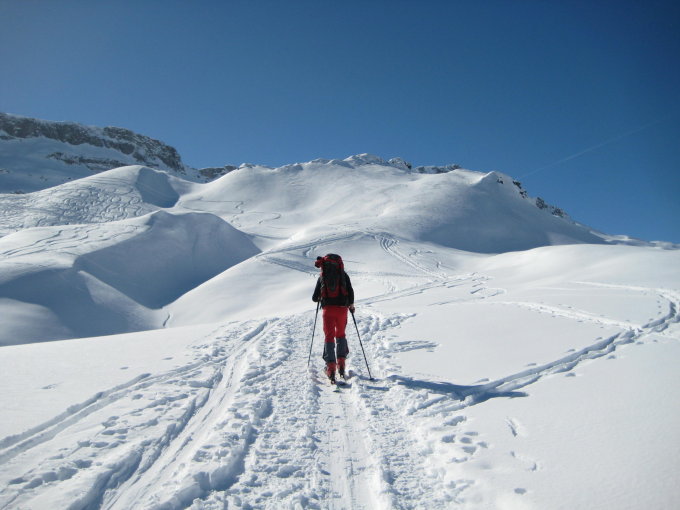 Sonne pur im Aufstieg, kein Wind, warm, gute Spur.