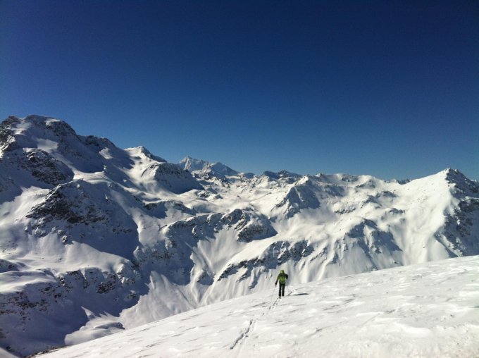 Obwohl alles ziemlich verfahren war, haben wir vom Gipfel noch ein steiles Couloir gefunden welches unberührt und der Schnee noch feinster Pulver war.