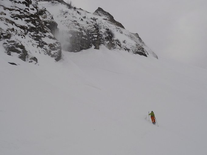 Grosse Triebschneeansammlungen unterhalb Obrist Arni wegen des starken Föhns gestern.