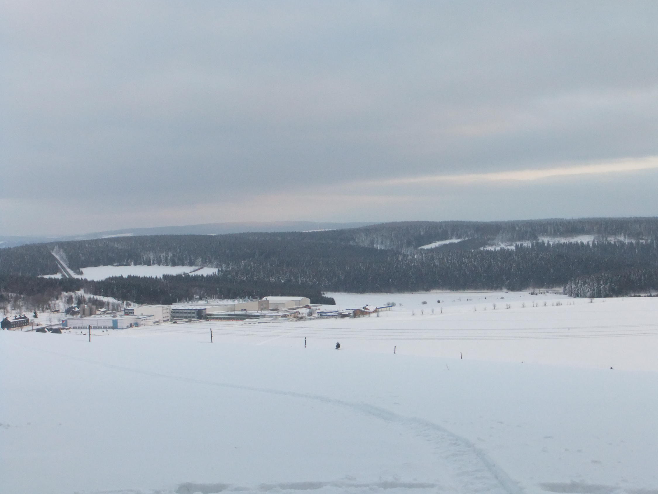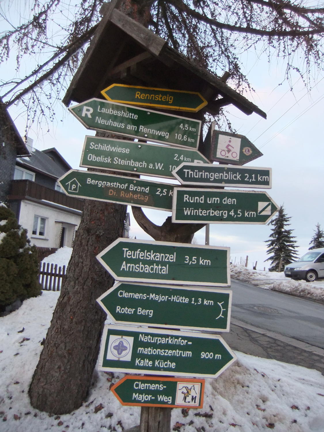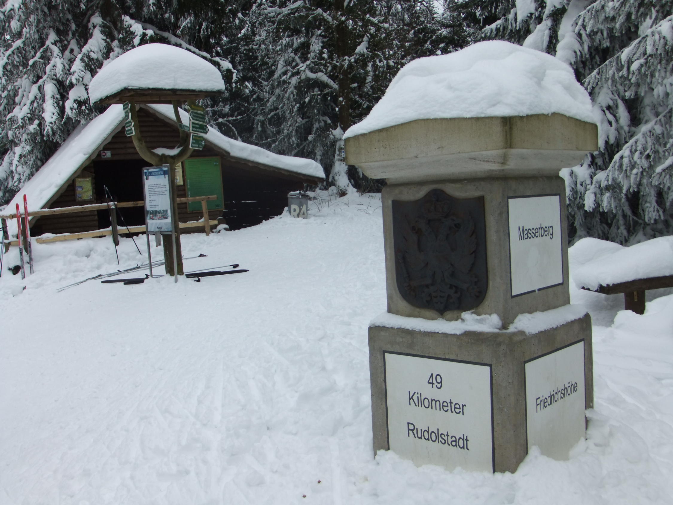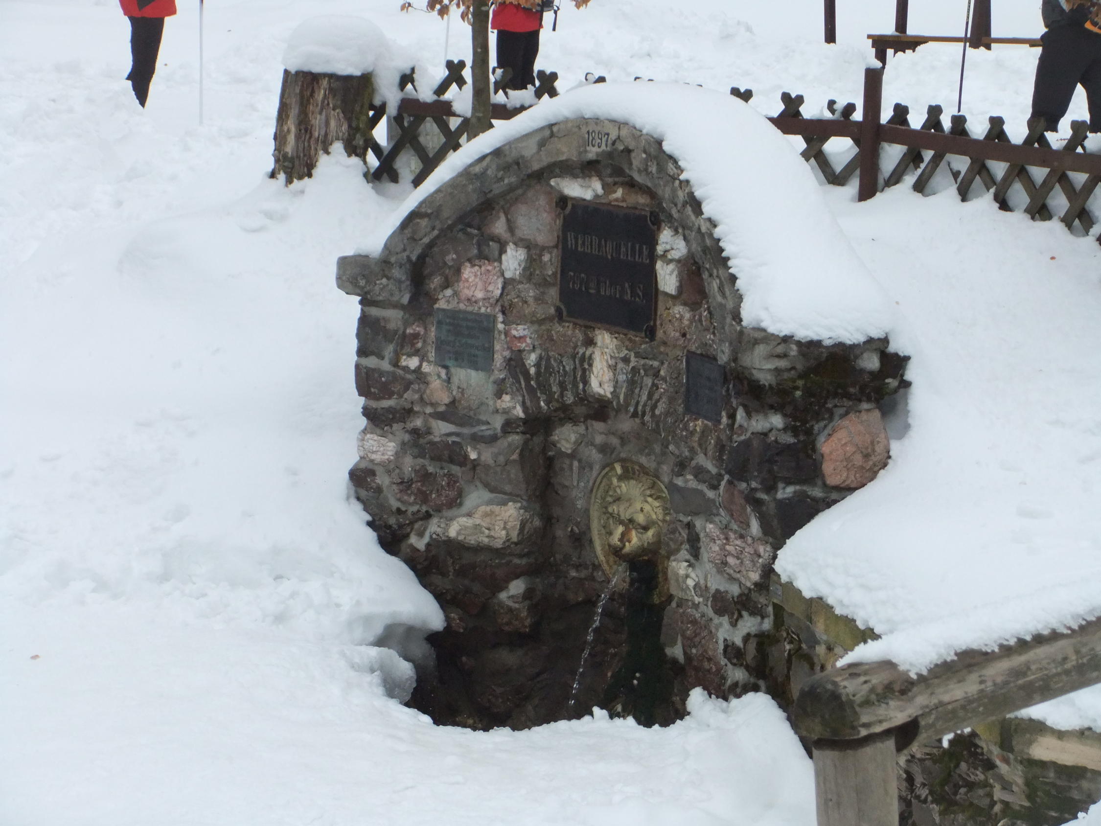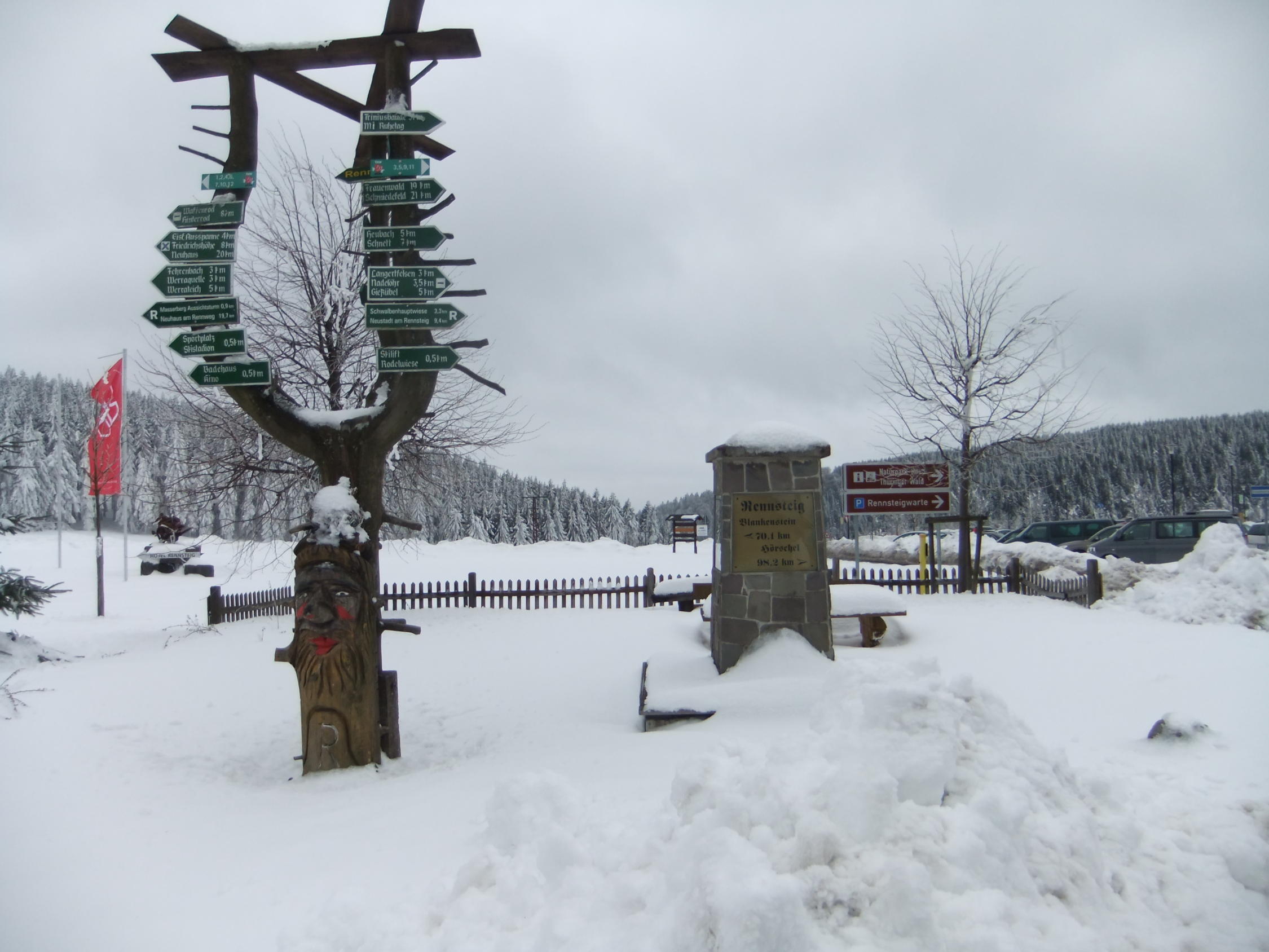 Da vormittags das Wetter keine großartige Sicht bot, und der Weg durchs Werratal frisch gespurt war, verzichtete ich auf den Aufstieg zur Rennsteigwarte, sondern besuchte die Werra-Quelle südlich unterhalb vom Rennsteig und fuhr von dort weiter zur Heidehütte hinauf und von dort auf dem Rennsteig weiter.
