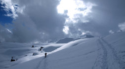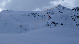 Insgesamt sind die Bedingungen in dieser Höhe derzeit nicht so berauschend. Dies gilt auch für nordseitige Ziele wi z. B. den Tristkopf. Der wenige Neuschnee reicht nicht aus, um die alten Schwunggruben zu bedecken, und so leidet auch hier der Genuss.