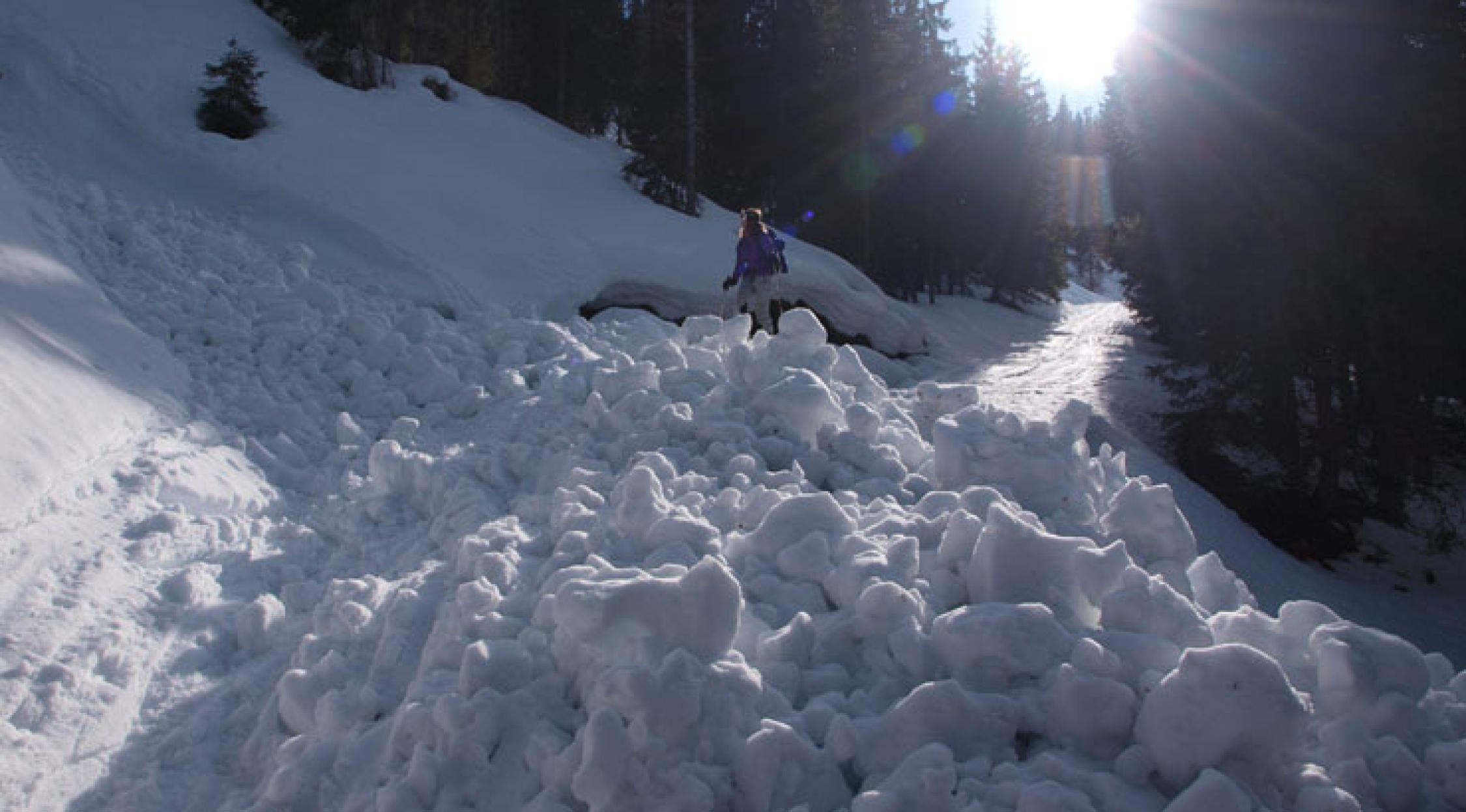 Zwei Grundlawinen von vermutlich gestern auf der Forststrasse. Ebenfalls mehrere Schneerutsche bis auf Grund mit unterschiedlichen Ausmassen. LLB 2 scheint mir recht optimistisch, die Schneedecke ist komplett durchfeuchtet.