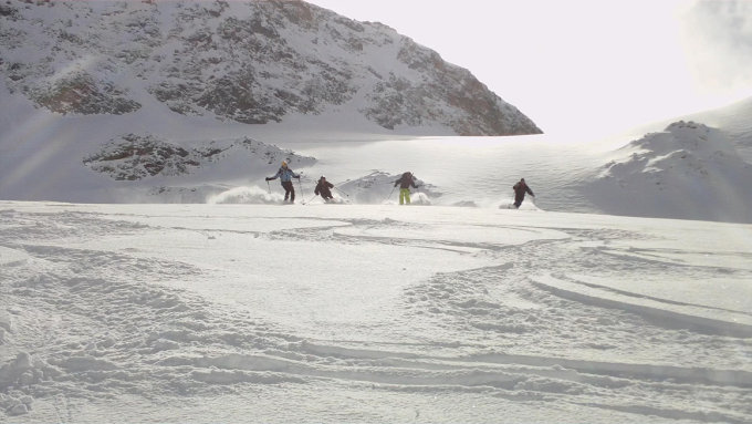 Pulver N und S hang , in Calderas Vadret superschnee, enige stein abstieg etwa 3200-3250m skitrage (wie man im Video sehen