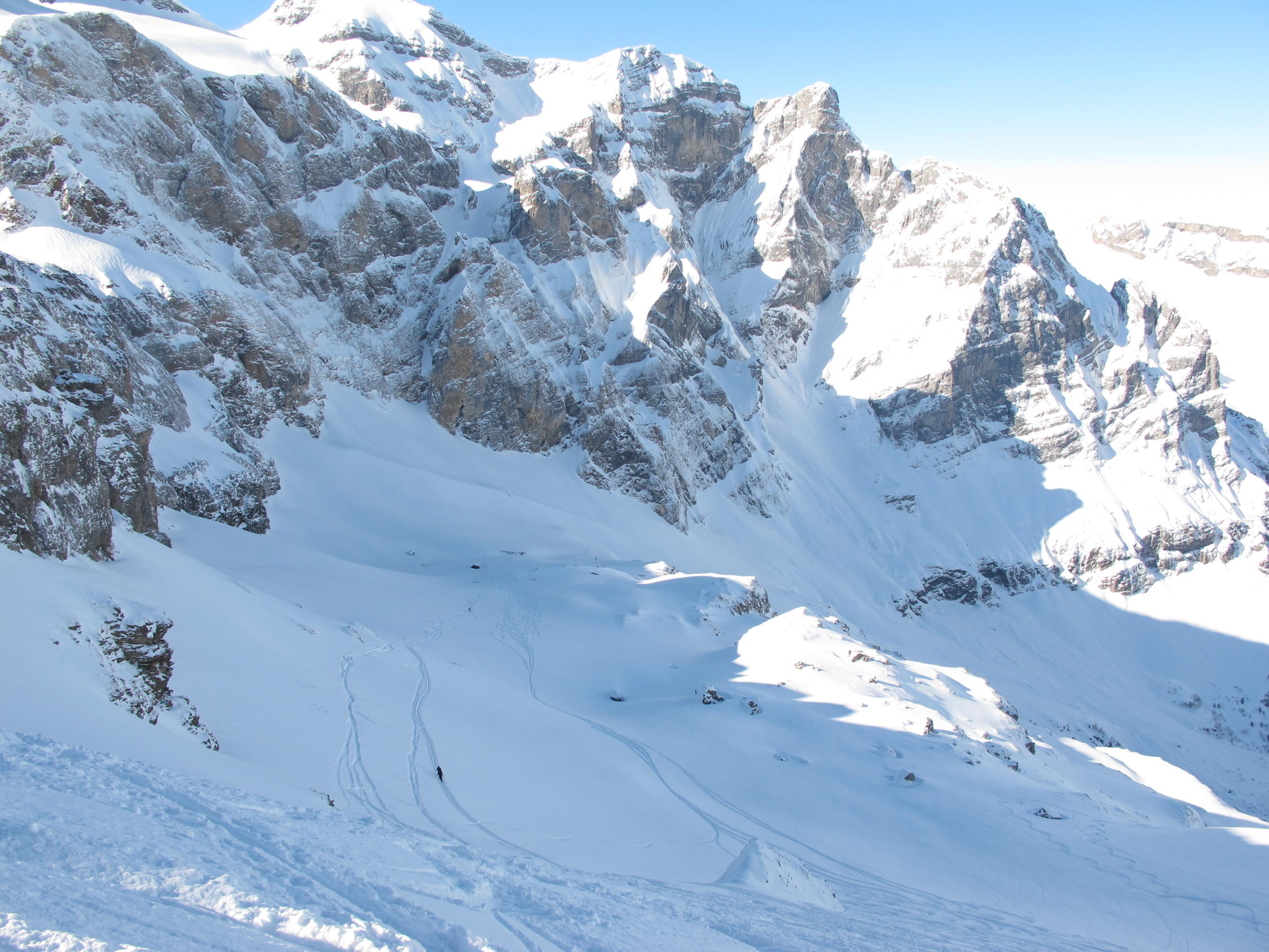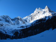 Dünne Schneeauflage am Gipfelanstieg. Besser durchs Col abfahren!