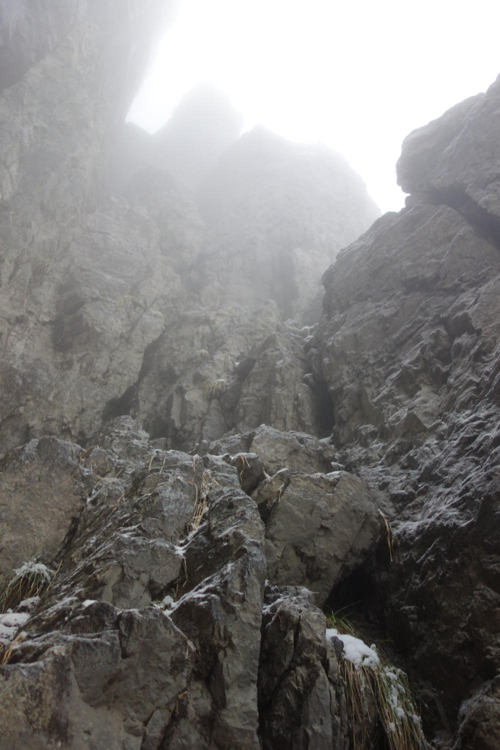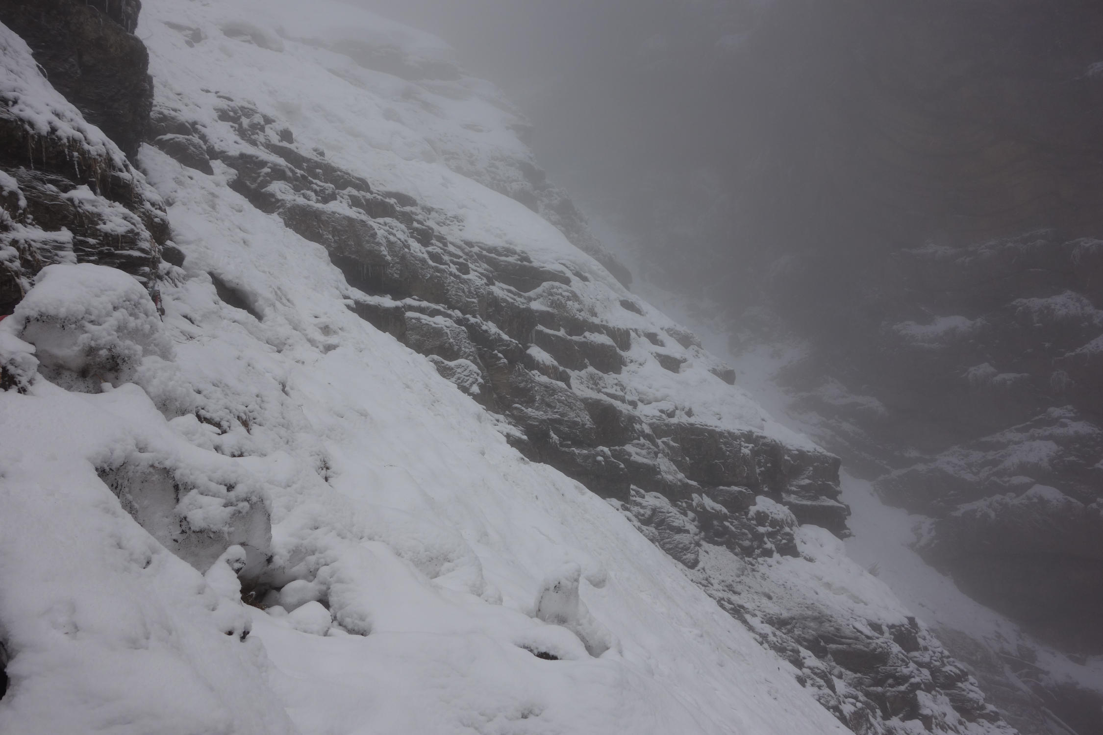 Es gibt nur ganz wenige Tage im Winter, wo die Route sicher begangen werden kann. Folgenden Bedingungen müssen zwingend erfüllt sein: 1) Geringe Lawinengefahr 2) Temperaturen unter dem Gefrierpunkt 3) bedeckter Himmel (damit kein Steinschlag im Sonnenbeschienen Ausstieg entstehen kann) 4) Guter Trittschnee --> alles ist zur Zeit gewährleistet.