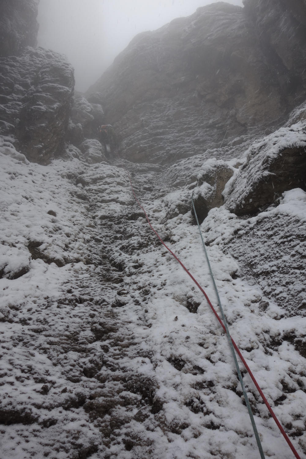 Die letzte Seillänge mit direkten Ausstieg ist momentan relativ heikel. Es hat im obersten Teil kaum noch Schnee und man bewegt sich auf abwärtsgeschichtetem Schiefer mit kaum Sicherungsmöglichkeiten. Wir sind damit über das 45 Grad steile Schneecoloiur auf der rechten Seite ausgestiegen und so rund 20 unter dem Schluchtende rausgekommen.