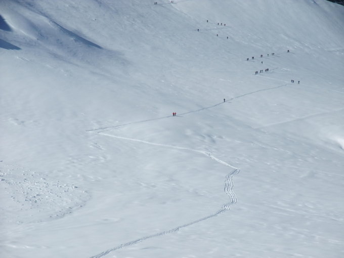 Auf der ganzen Strecke bis nach Frühstücksplatz ca. 15 cm frischer Pulver auf Unterlage. Nach Frühstücksplatz und v.a. auf dem Gipfelplateau verblasen und hart. Alles in allem gut zu fahren. Gute Spur am Frühstücksplatz wobei die grosse Wächte ein wenig am Rucksack schabt. Abfahrt dann durch die Couloirs Richtung Skigebiet. Hier gut und pulvrig. Ab und an musste man ein wenig auf alte und überwehte Spuren achten. Danke den drei Vorspurern. Alle anderen Gipfel in der Region als auch die Abfahrt nach Lenk wurden auch gemacht.