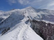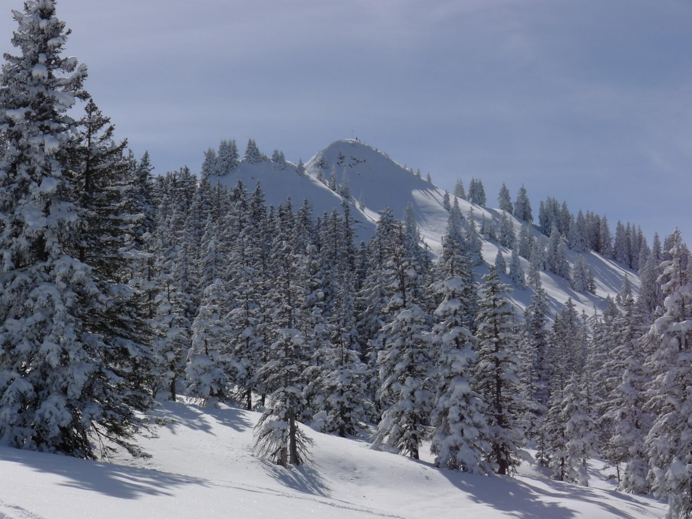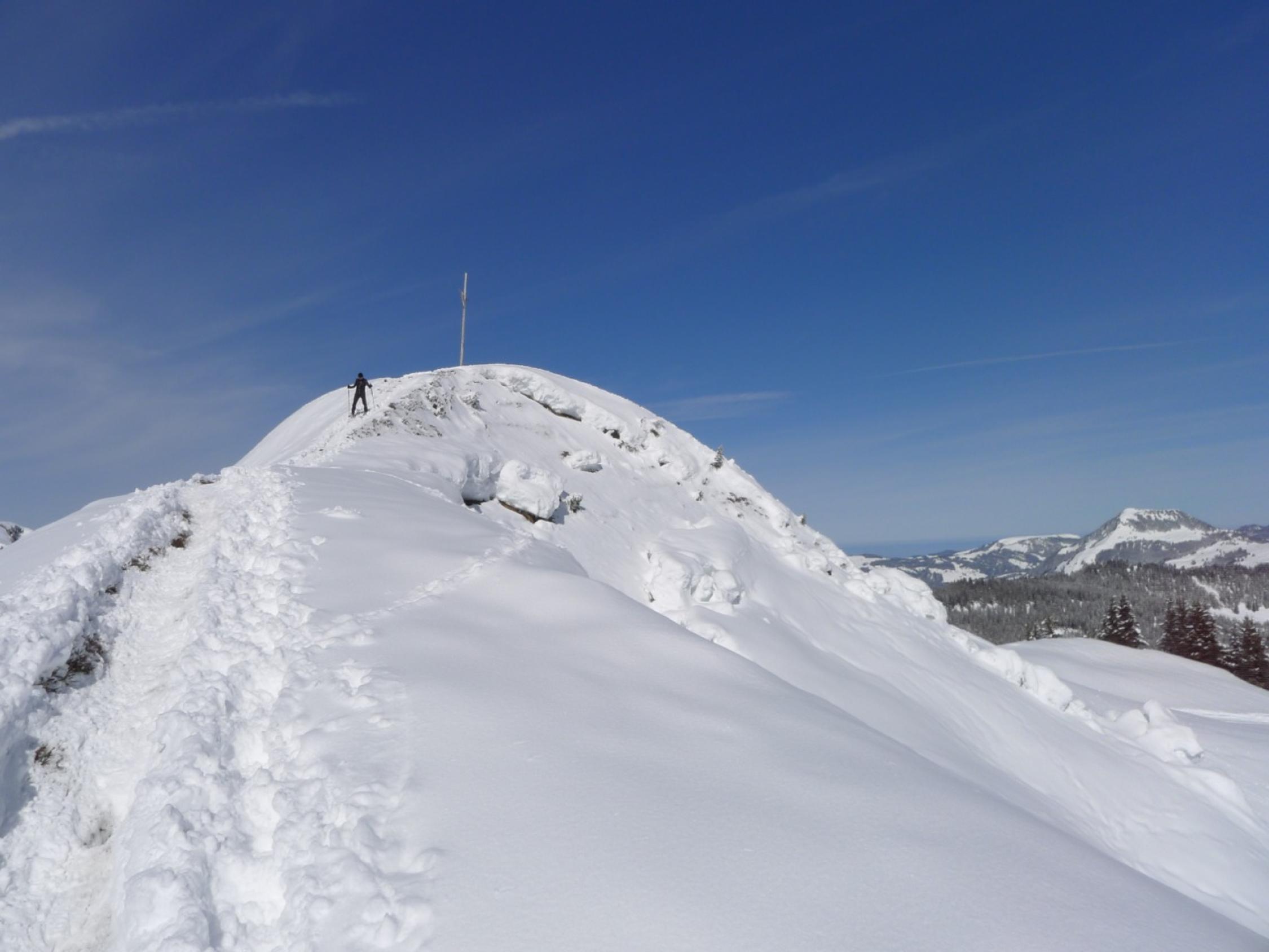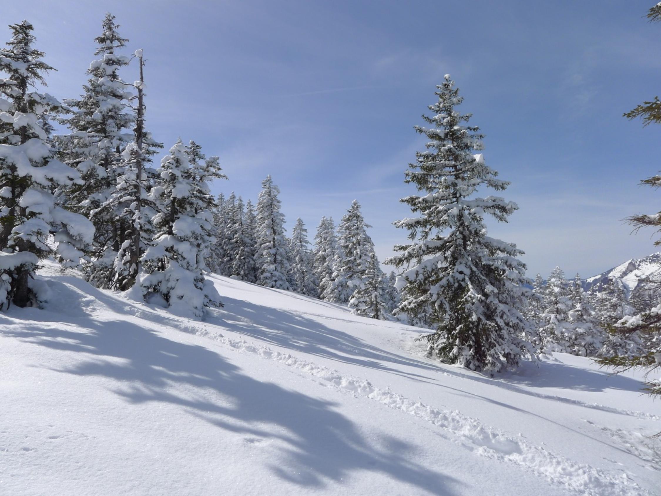 Neuschnee auf tragender Altschneeschicht. Gipfelbereich teilweise abgeblasen, dafür viel Triebschnee im Wald