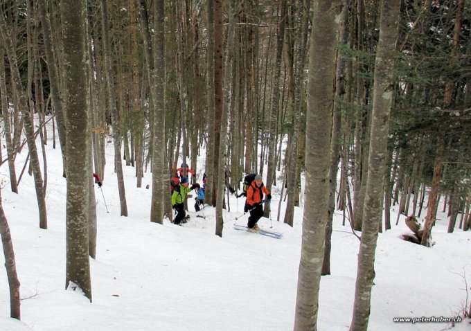 Für die Abfahrt: Der Schnee ist stark verblasen auf gut tragender Unterlage. Wir haben nur oben einige lohnenswerte Mulden gefunden. Darunter sehr wechselhaft. Unten feuchter Schnee und ab Rinderweid pistenmässig. Es hat genug Schnee für den Aufstieg durch den Wald bei Chruter und die Abfahrt via Fälleggen.