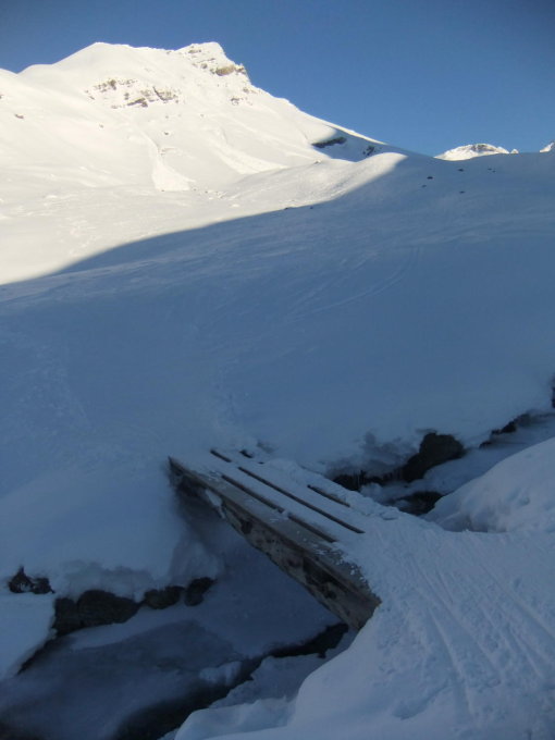 Heikelste Stelle an der Tour ist wohl letzter Hang südwestlich vor der Chamanna Jenatsch. Diesen traversierte ehemaliger Hüttenwart (Heini) am Tag vor dem Heiligen Abend von 2011 mit Tourenski. Trotz erheblicher Lawinengefahrstufe, um die Hütte beginnen zu bewarten über die Feiertage. Dabei löste er eine Lawine aus, in welcher er sein Leben verlor. Da der Hang heute ziemlich freigeblasen war, schätzte ich die Triebschneefahr als gering ein, und stieg diesen direkt ab und auf dem Rückweg anschließend wieder auf. Ein seitliches Traversieren war aufgrund steiler Hanglage mit den breiten Schneeschuhen nur sehr schwer möglich, im Gegensatz zu kantigen Tourenskiern. Bei hoher Triebschnee-Gefahr ist es besser, mit Schneeschuhen dort nicht den Tourenskispuren zu folgen, sondern vor einem alten Lift-Rad rechts (ostwärts) hinab in die Rinne zu steigen, von wo man dann allerdings zur Hütte wieder aufsteigen muß. Tourenski-Fahrer queren den Hang wohl am besten ganz oben, oder ganz unten.