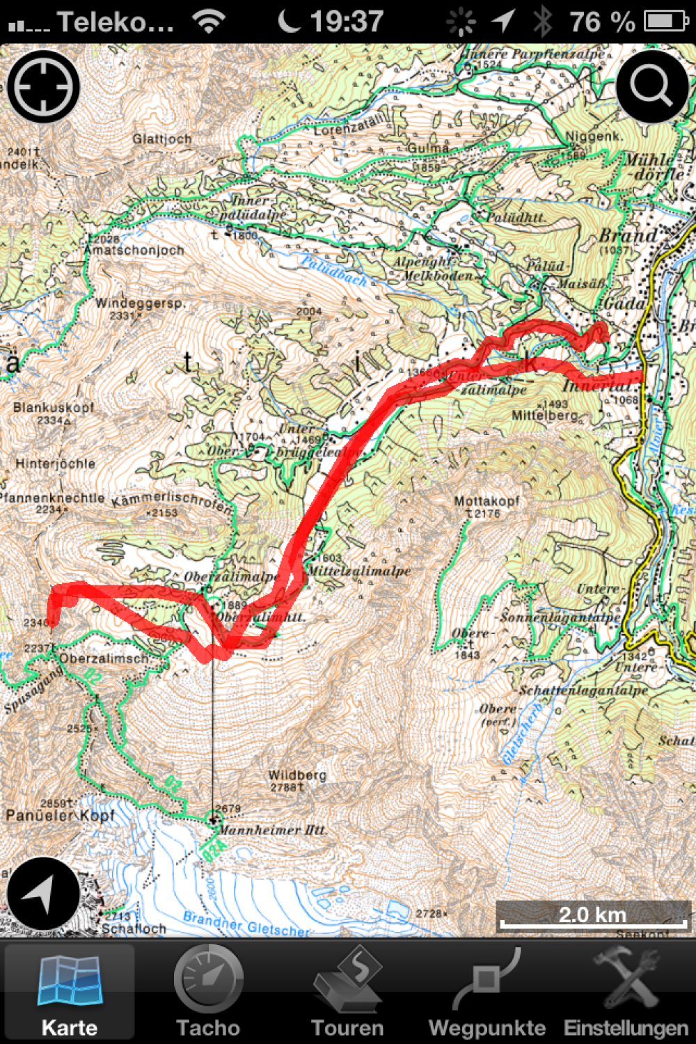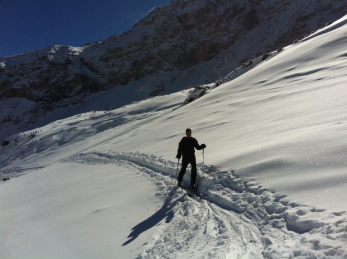 Für den Start ab Brand fehlt jetzt der Schnee; man kann statt dessen die Bahn (Palüd) nehmen und auf der Piste abfahren