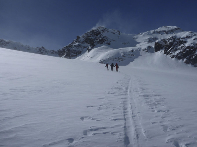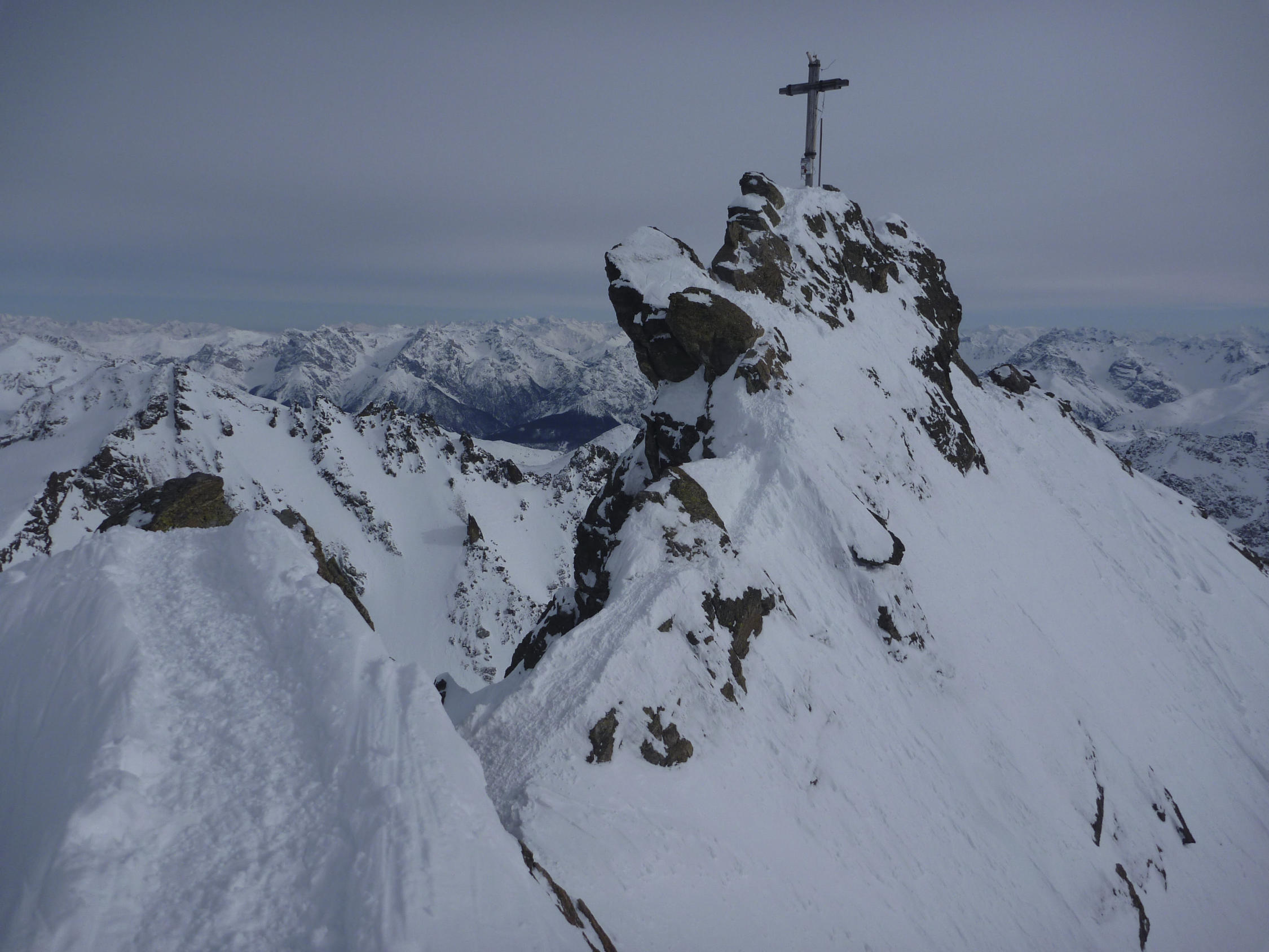 Gipfelaufbau wenig heikel, Felsen teils frei, sonst guter Trittschnee. Ohne Seilsicherung möglich, Steigeisen nützlich.