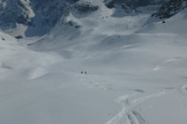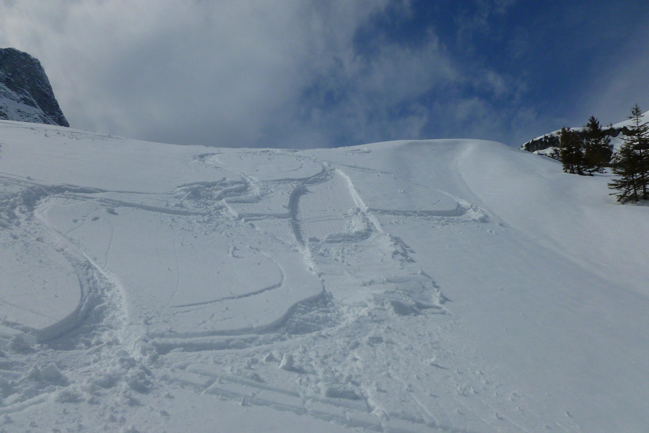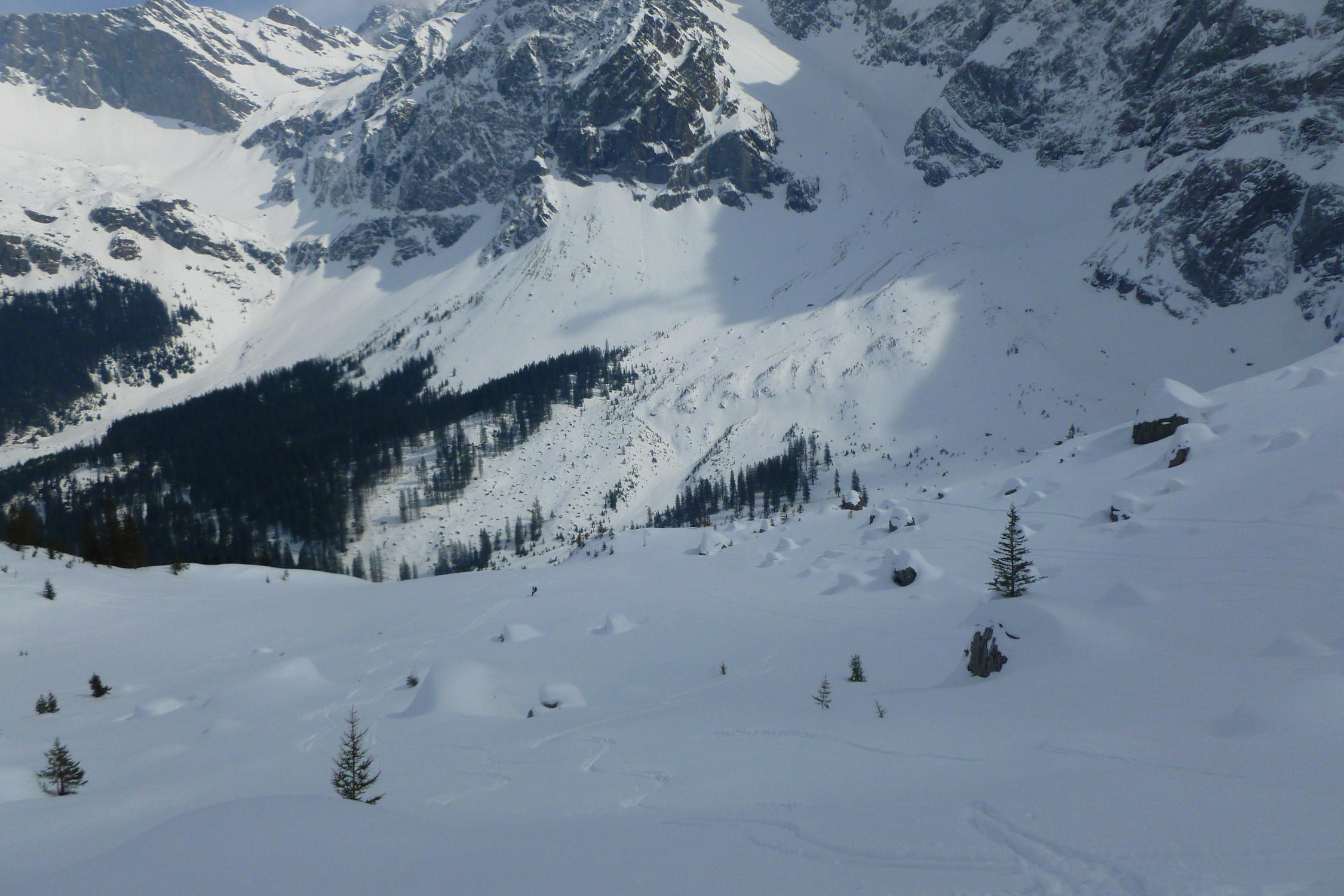 noch viel Schnee im Gebiet; schon Sulzschnee in den Sonnenhängen, unten schwer, aber immer noch gut zu fahren!