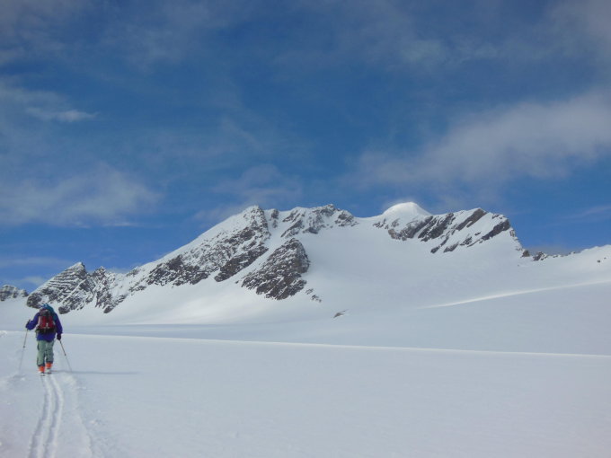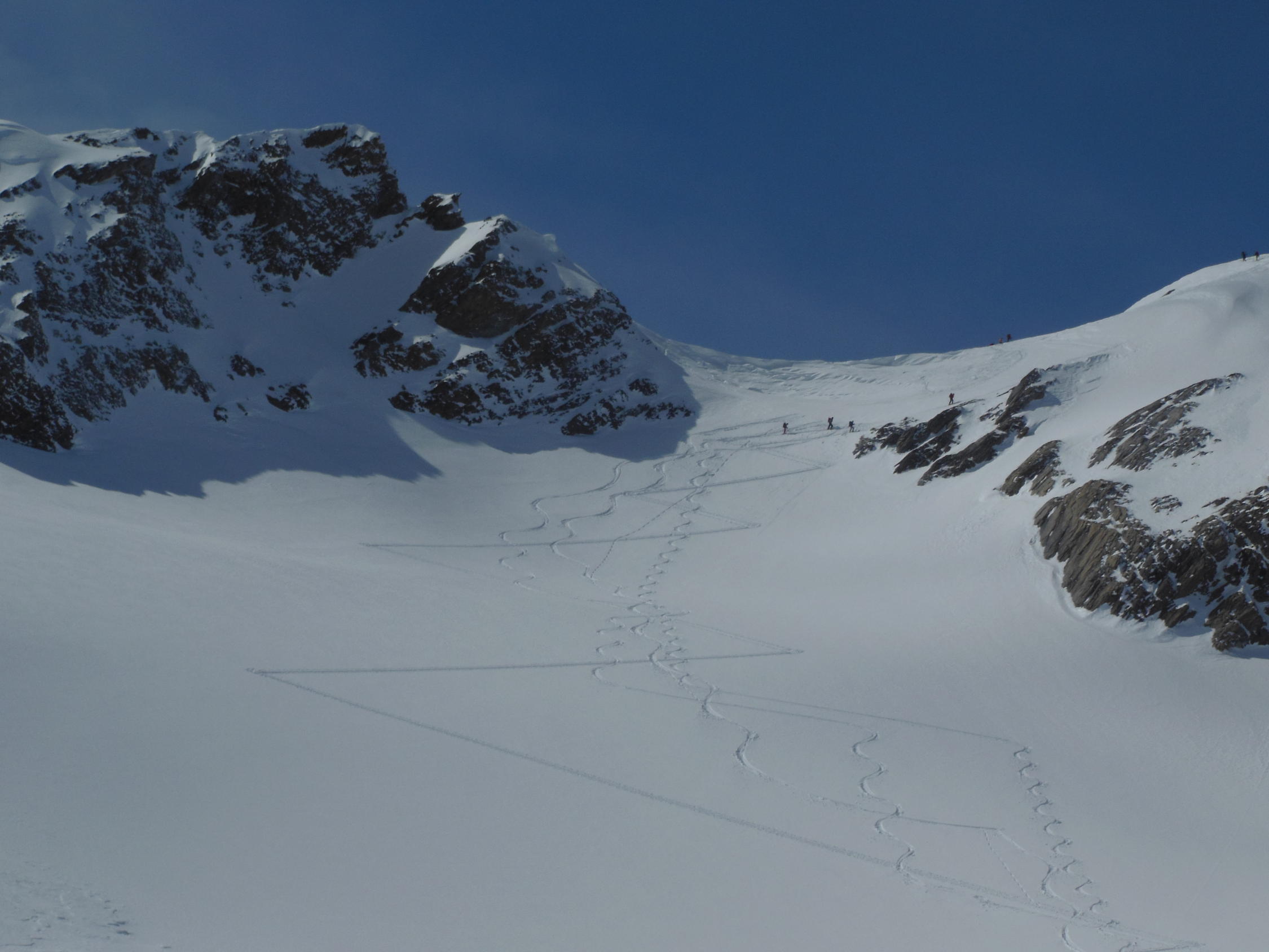 Gletscher sehr gut eingeschneit, Gipfelhang bis oben mit Schnee