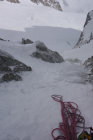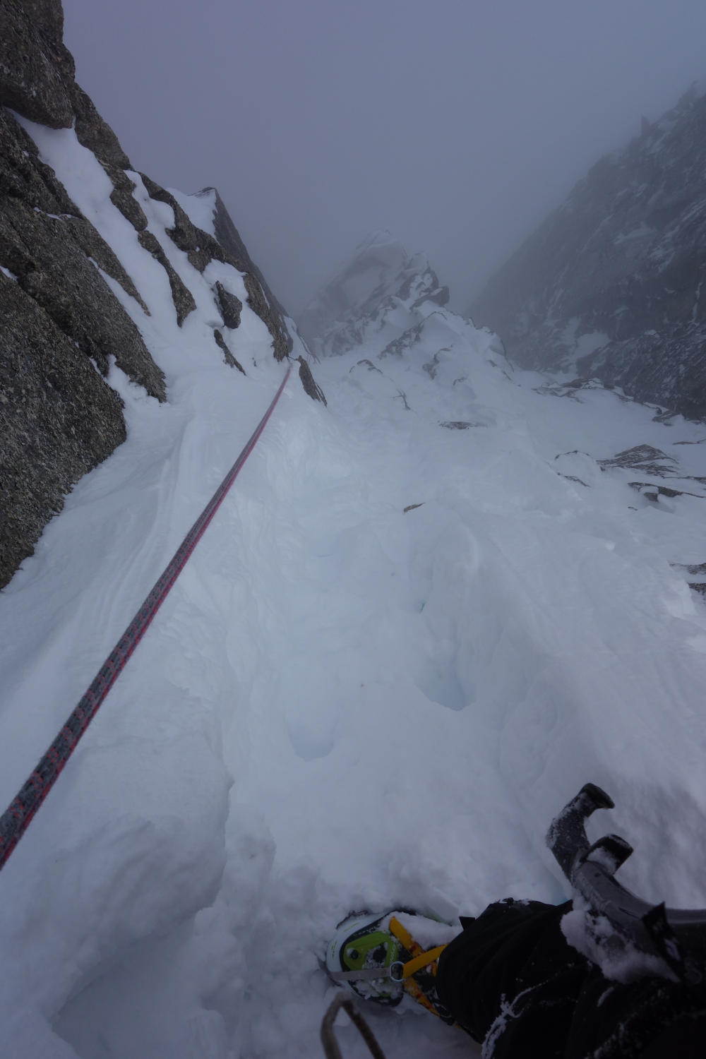 Die oberen vier Seillängen sind mit neuen Bohrhaken-Ständen ausgerüstet (total untypisch für Chamonix ... ). Wir haben jedoch im unteren Teil der Route keinerlei Bohrhaken gefunden, was vielleicht mit dem relativ vielen Schnee zu tun hat.