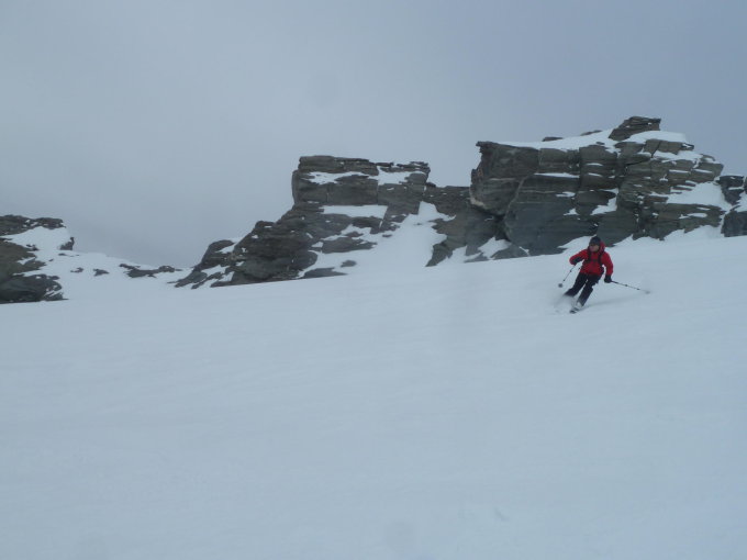 Abfahrt mehrheitlich guter Schnee - teilweise schwerer Pulver und feiner Pulverschnee, gut drehbar auf tragender Schneedecke.