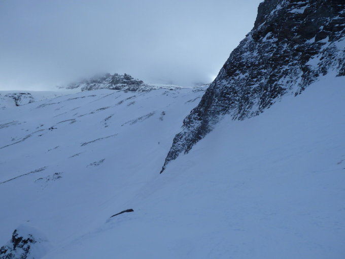 Dann im Homattu Firn starker Südwind und zunehmend Nebel und schlechte Sicht. Auf dem Breithornpass Richtung Breithorn Nebel. Traverse zum Gipfel hat sich nicht mehr gelohnt. Auf Vorgipfel -letzte Schritte zu Fuss umgekehrt.