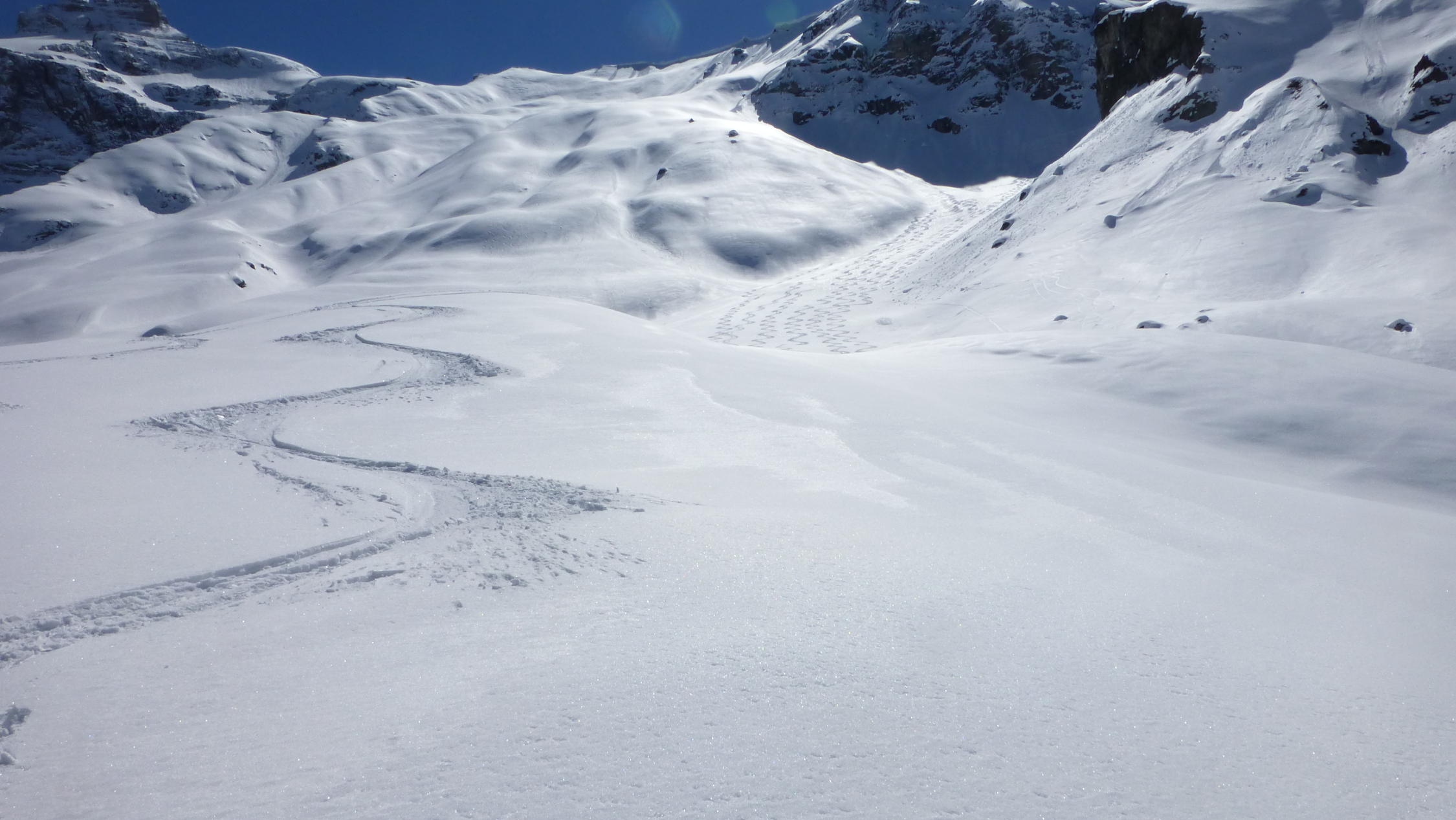 Traumhafte Landschaft, frisch verschneit fast wie an Weihnachten. Wunderbare Pulverhänge, vom Gipfel bis Griesalp. Strasse Griesalp - Tschingel super zu fahren.