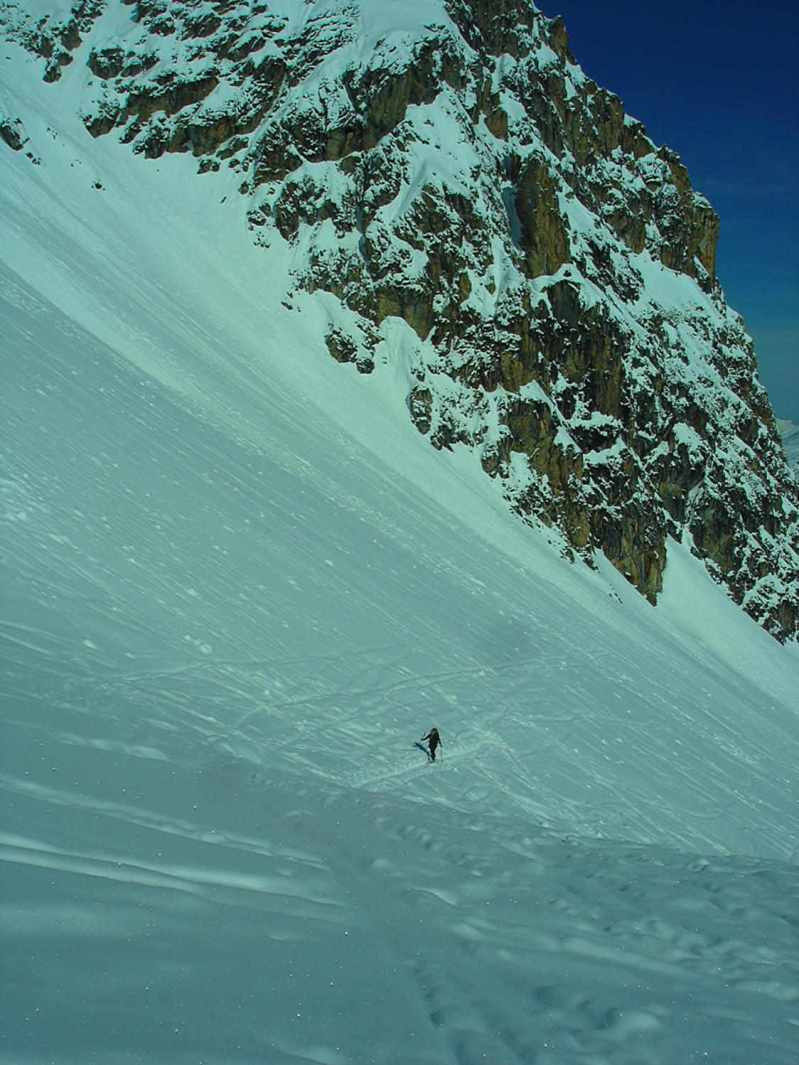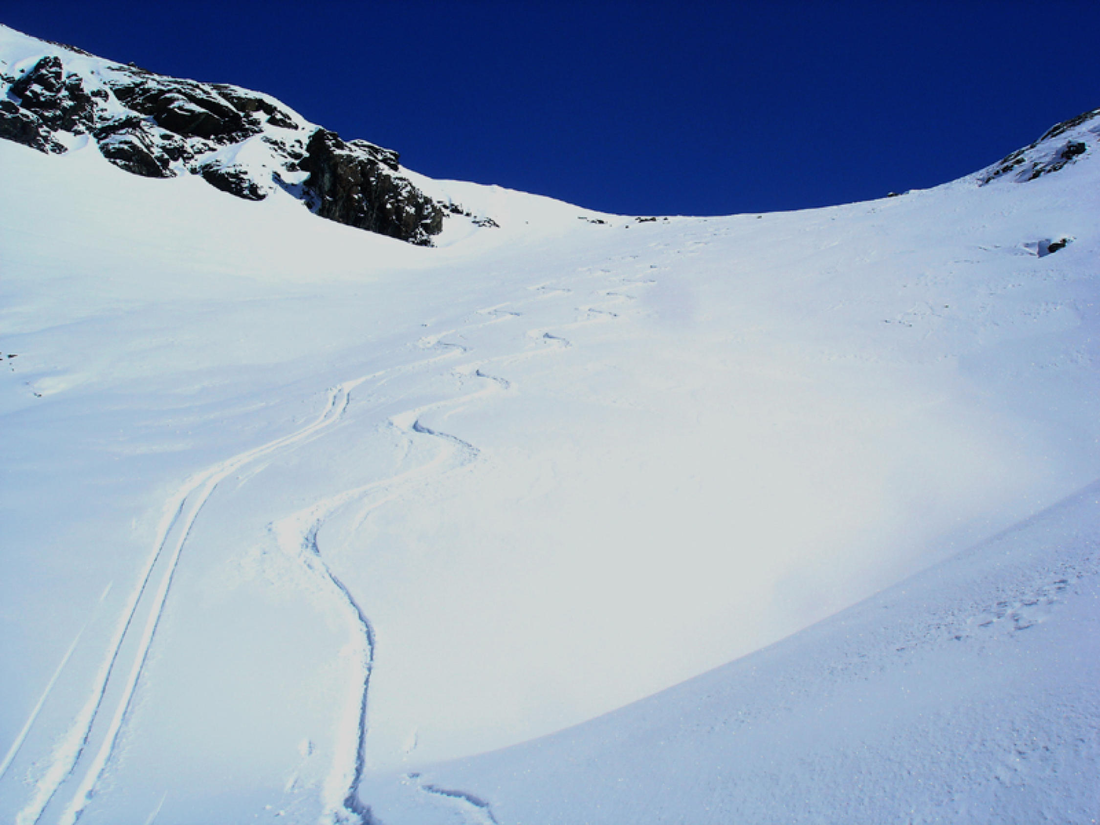 Abfahrt am folgenden Tag über unbenannte Scharte 2400 ins Mölstal zum Lager Walchen. Genaue Geländekenntnis erforderlich da steile Abbrüche über dem Möls Hochleger. Fehlerquote geringer wenn man von der Mölser Scharte abfährt