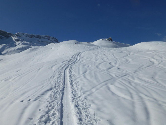 Wir nutzten das gute Wetter am Morgen für den Aufstieg und genossen die warme Sonne.Doch auf dem Giepfel änderte sich das Wetter schnell von Westen her und wir konnten keine lange Rast mehr machen.Der Schnee war recht gut doch die mit der Sicht happerte es ein wenig.Neuschnee hatte es etwa 25 cm gegeben,der im untern Teil etwas nass wurde.