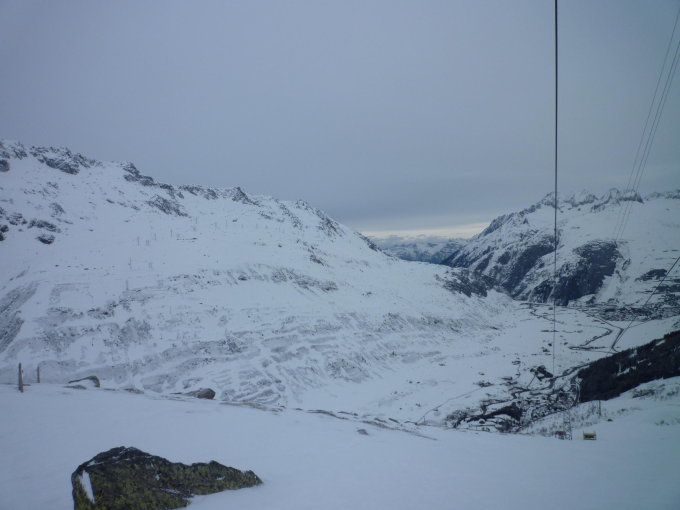 Windverfrachtungen durch mässigen Wind. Gegen 9 Uhr wurde das Wetter schon schlechter und der Gipfelhang teilweise in den Wolken und unter dauerndem mässig kaltem Wind.