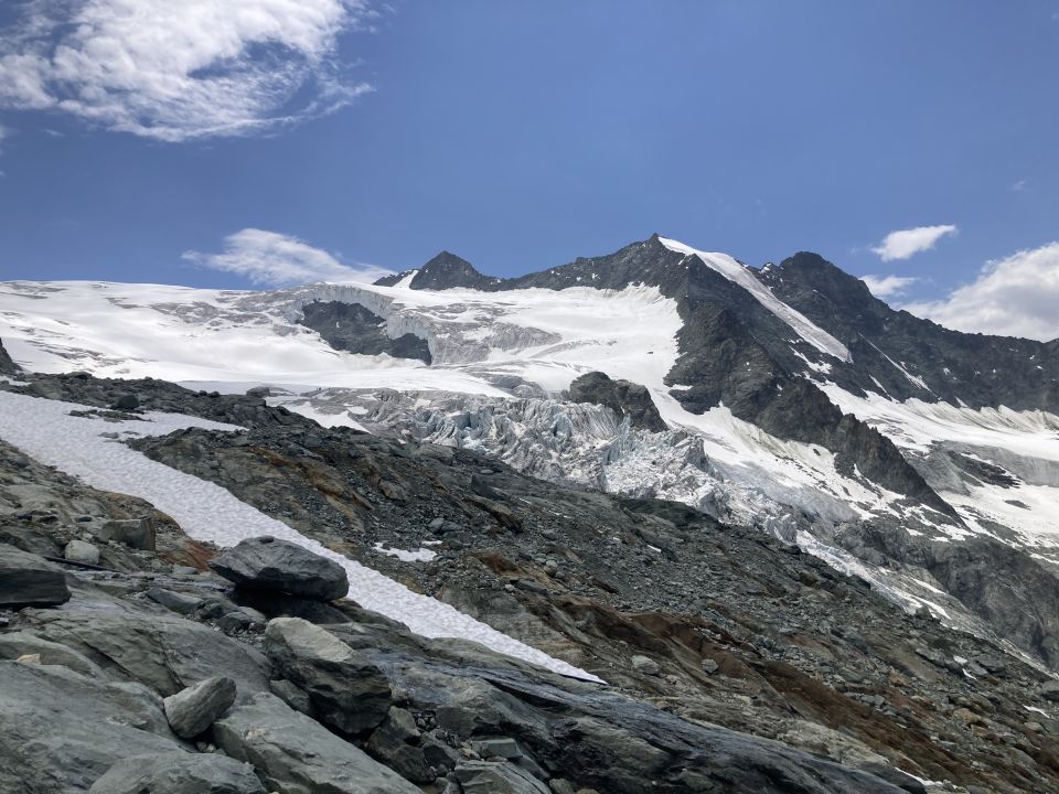 Gletscher noch gut zugedeckt. Achtung im flachen Teil auf ca. 3100m an drei Stellen werden Spalten sichtbar/spürbar. Der Übergang vom Gletscher zum Fels geht gut, der Blockgrat ist ausgezeichnet und das obere Firnstück weist eine gute Spur aus. Die Fortsetzung zur Dent des Rosses ist wunderbar, auch der Abstieg über Südgrat problemlos.