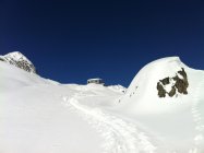 Es führt eine sehr gute Spur zur Hütte welche mit roten Stangen markiert ist.